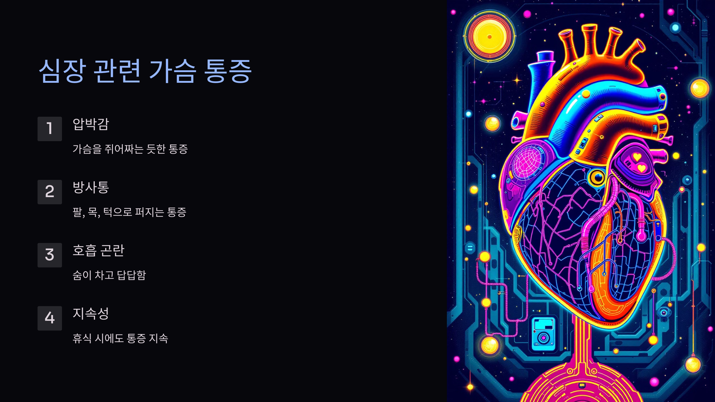 - 쥐어짜는 듯한 압박감이 특징이며, 팔, 목, 턱으로 통증이 퍼질 수 있습니다. 또한 숨쉬기 어렵거나 식은땀이 동반될 수 있습니다.