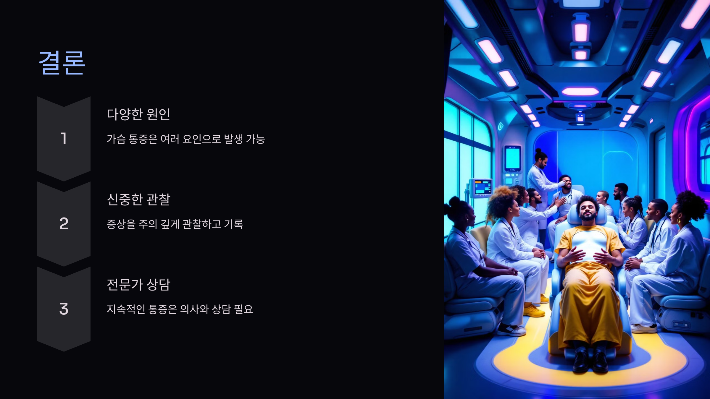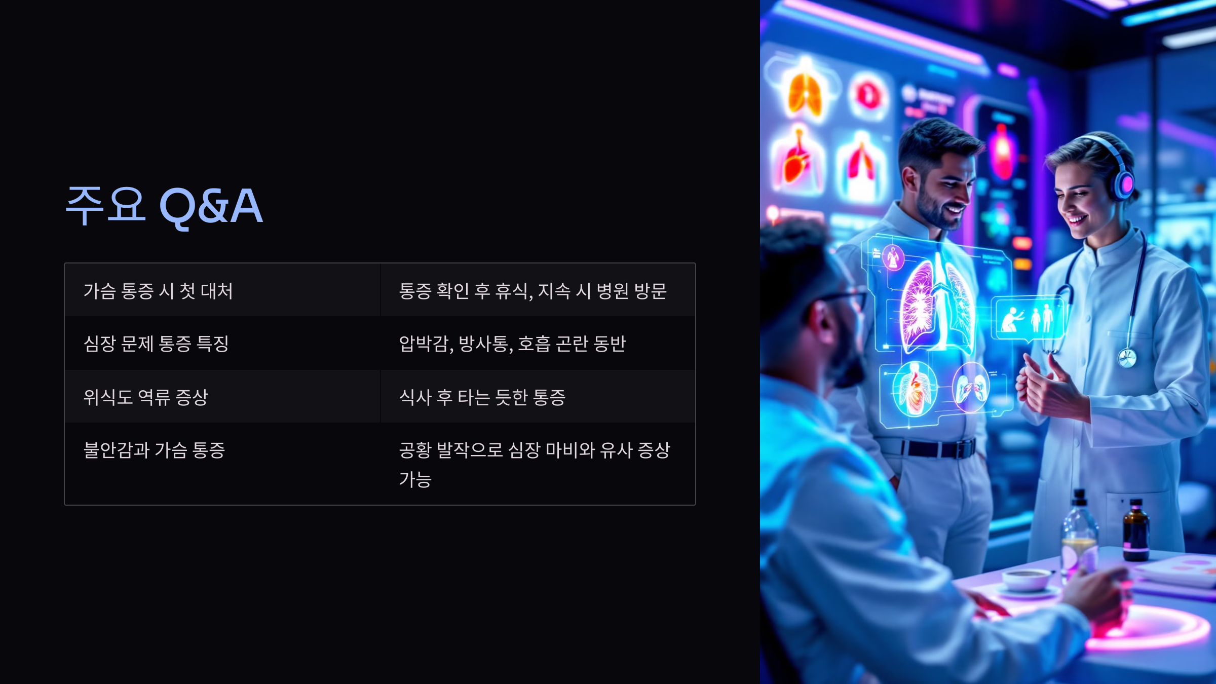 - 심각한 증상이 나타날 때는 응급실 방문: 호흡 곤란, 흉부 압박, 팔이나 턱으로의 방사통, 어지러움과 같은 증상이 동반된다면 지체 없이 의료 도움을 받아야 합니다.