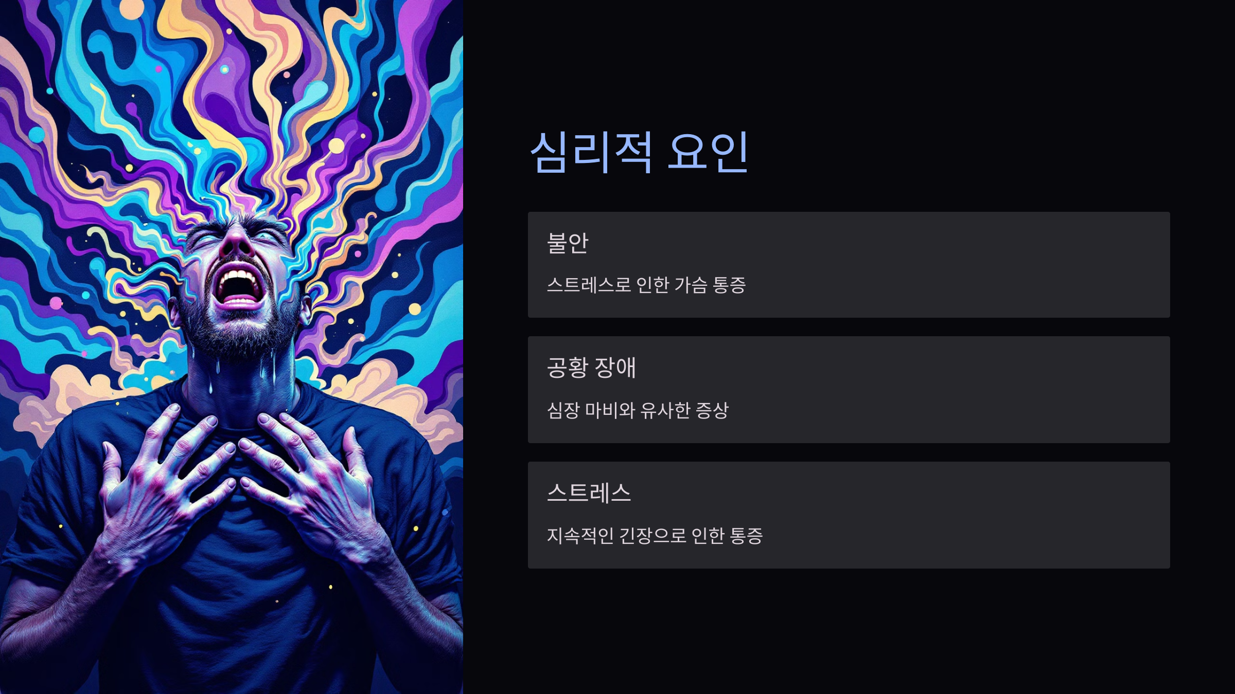 - 불안 또는 공황 장애: 심리적 스트레스나 불안이 가슴 통증을 유발할 수 있습니다. 특히 공황 발작은 심장 마비와 비슷한 증상을 유발하여 혼란을 줄 수 있습니다.