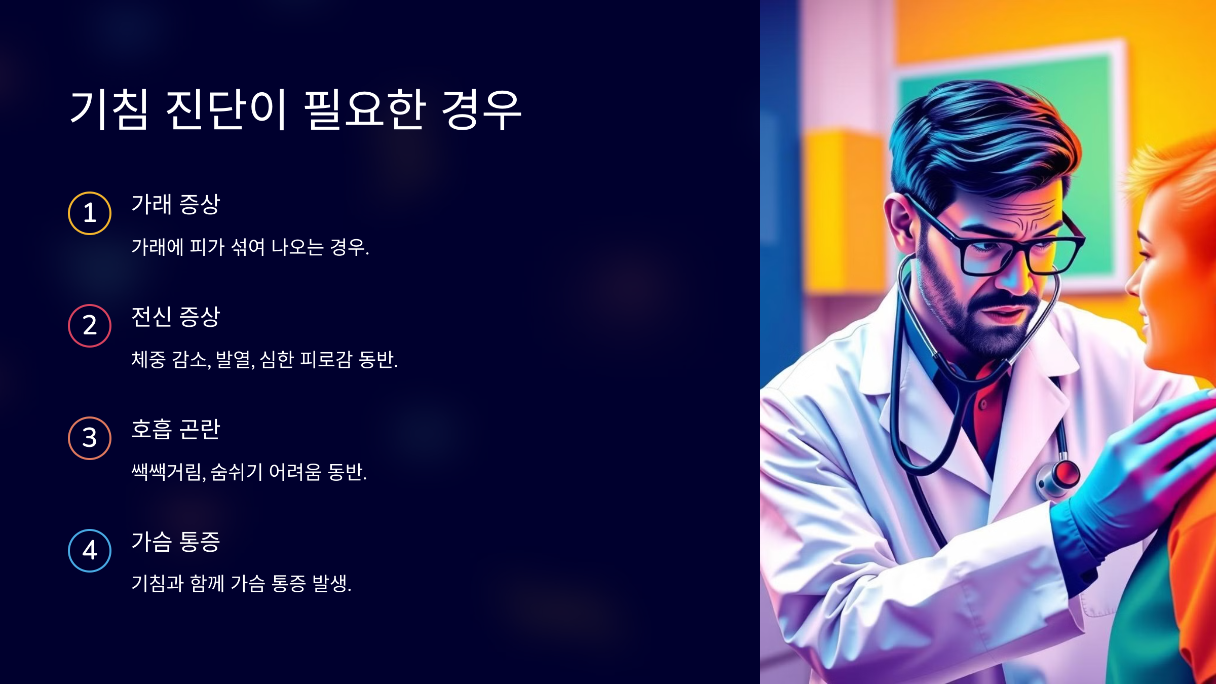 일반적인 감기와 달리, 아래와 같은 증상이 동반되거나 기침이 3주 이상 지속된다면 반드시 병원을 찾아 진단을 받아야 합니다.