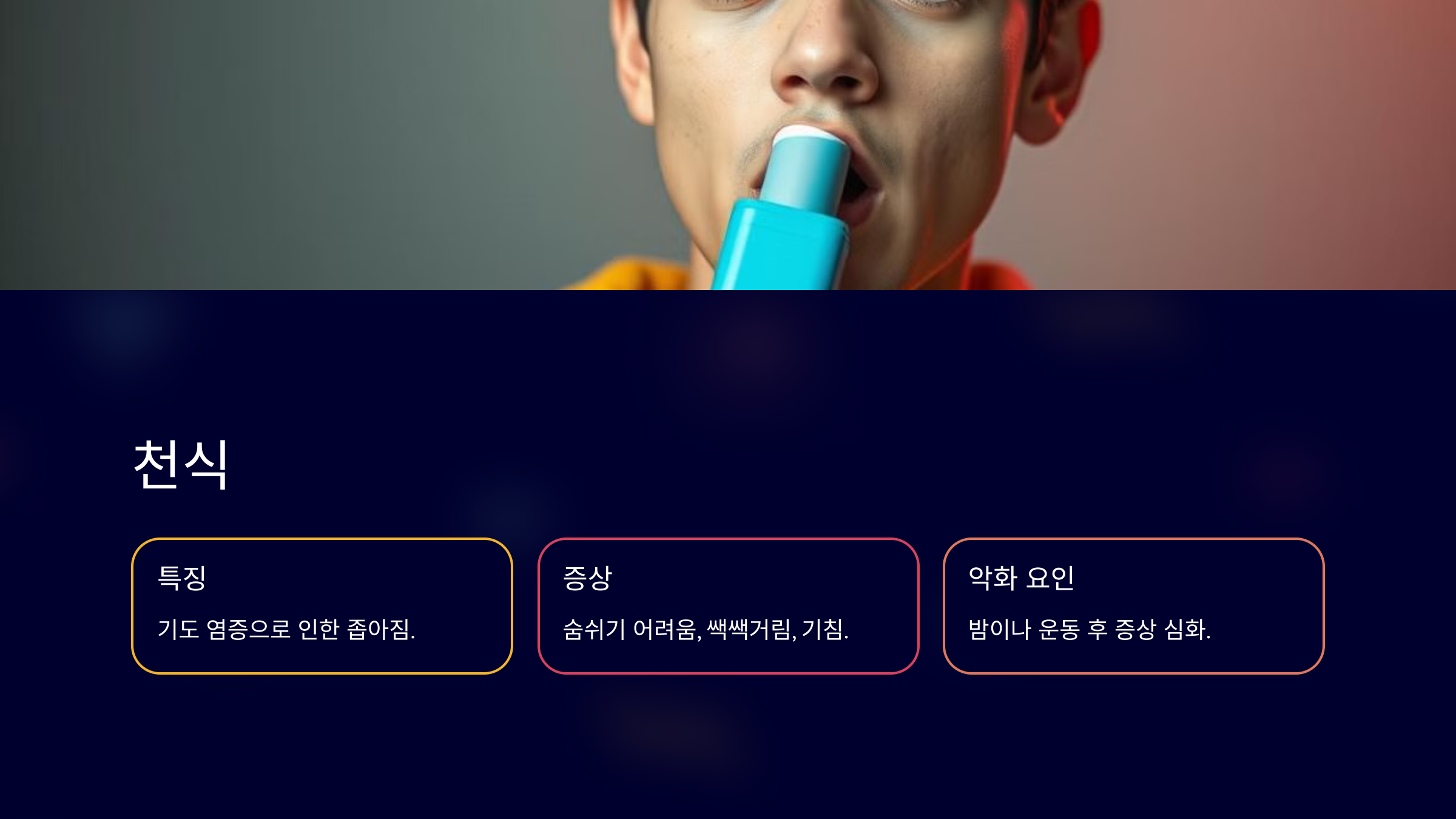 기침이 밤에 심해지거나 운동 후에 악화된다면 천식이 원인일 수 있습니다. 천식은 기도에 염증이 생기면서 기도가 좁아지고, 이로 인해 숨쉬기가 어렵거나 쌕쌕거림과 함께 기침이 나타나는 질환입니다.