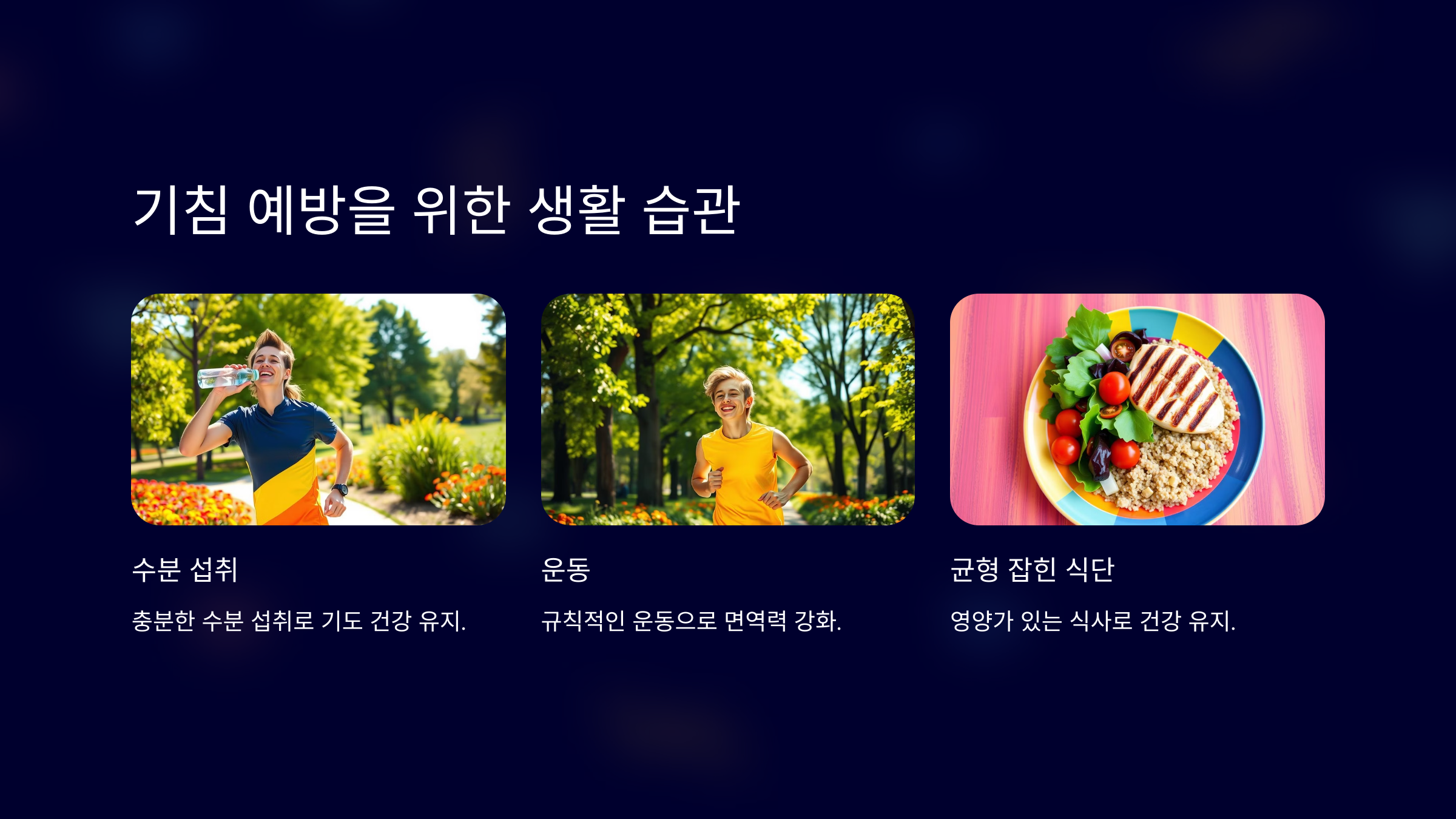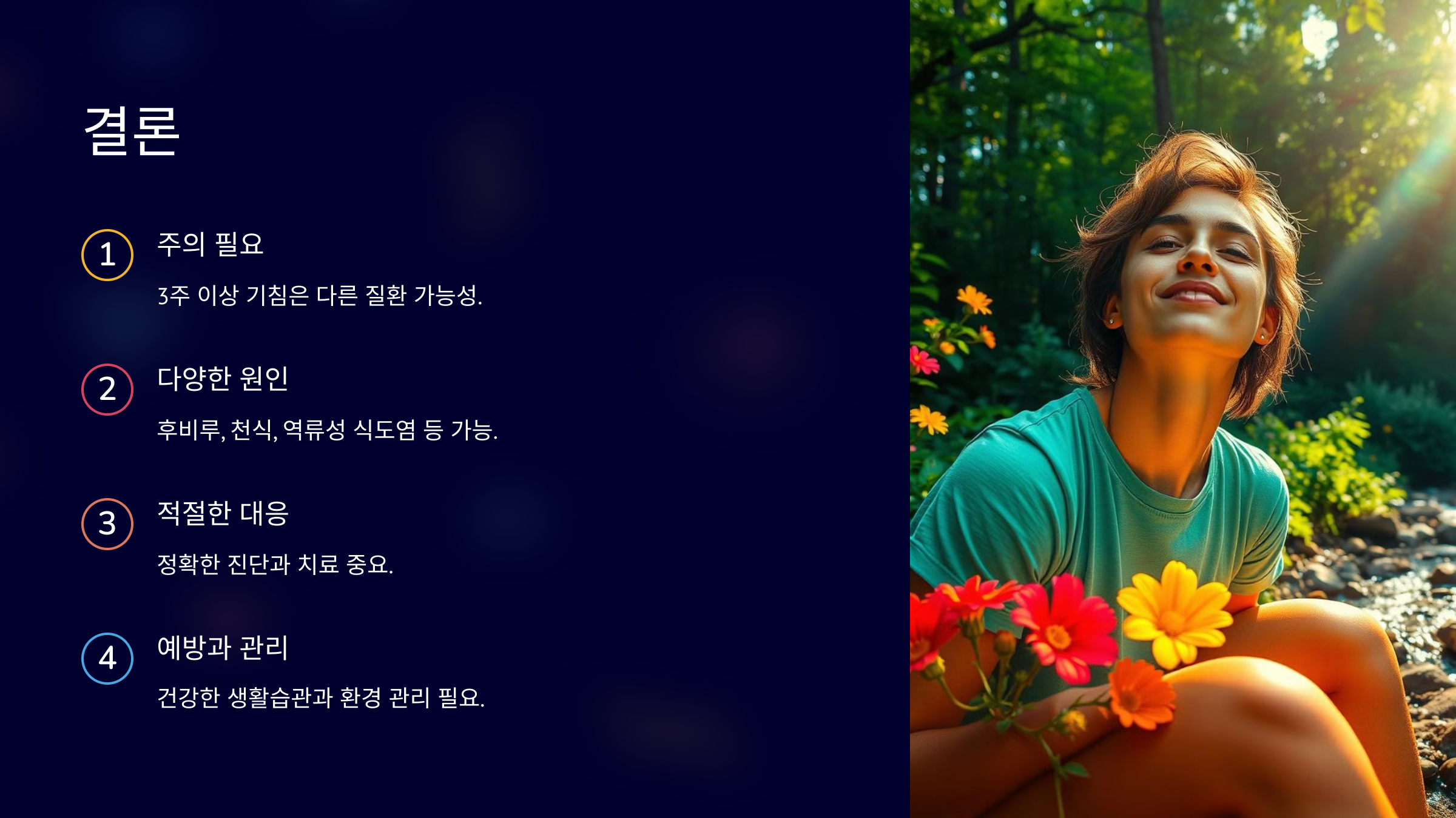 기침이 3주 이상 지속된다면 단순한 감기가 아니라 다른 질환의 신호일 수 있습니다. 후비루 증후군, 천식, 역류성 식도염 등 다양한 원인이 기침을 유발할 수 있으므로, 기침이 오래 지속되거나 악화된다면 병원을 찾아 정확한 진단과 치료를 받는 것이 중요합니다. 건강한 생활습관과 환경 관리를 통해 기침을 예방하고, 적절한 치료를 통해 증상을 완화할 수 있습니다.