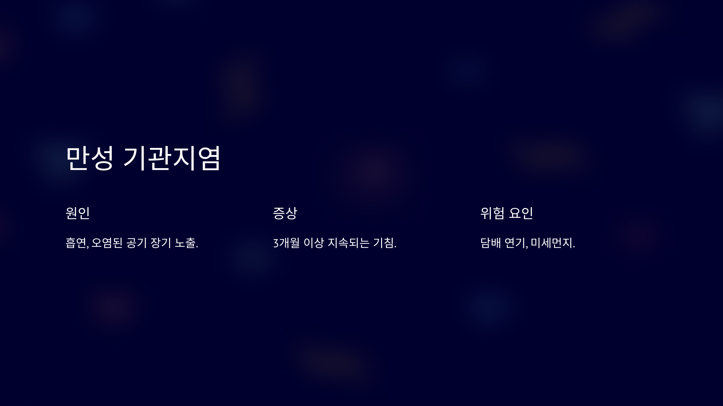 흡연자나 오염된 공기에 장시간 노출된 사람들은 만성 기관지염에 걸릴 위험이 큽니다. 이 질환은 기침이 3개월 이상 지속되며, 담배 연기나 미세먼지가 주된 원인이 됩니다.