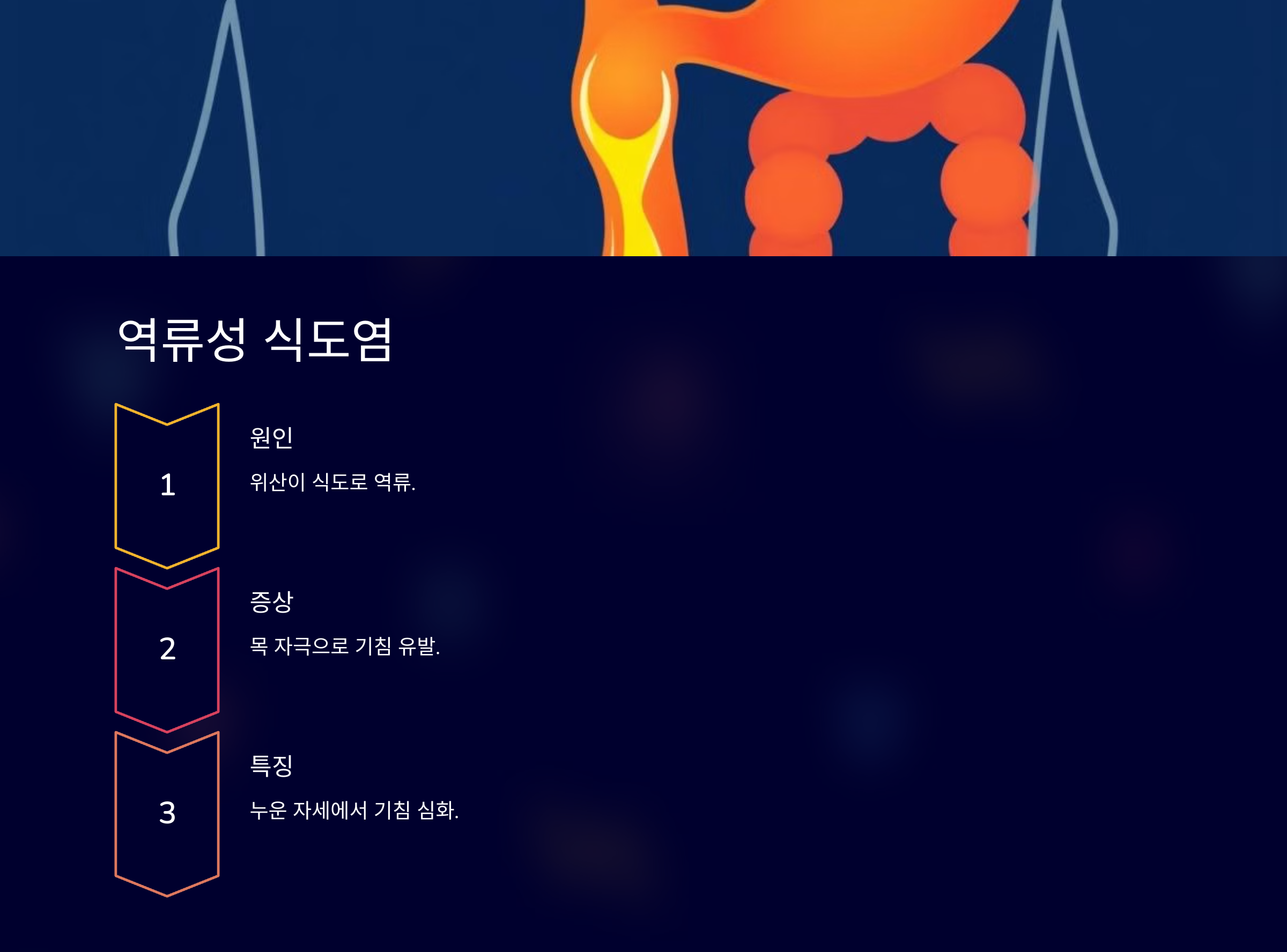위산이 식도로 역류하면서 목을 자극해 기침을 유발할 수 있습니다. 특히 누운 자세에서 기침이 심해진다면 역류성 식도염을 의심해볼 필요가 있습니다.