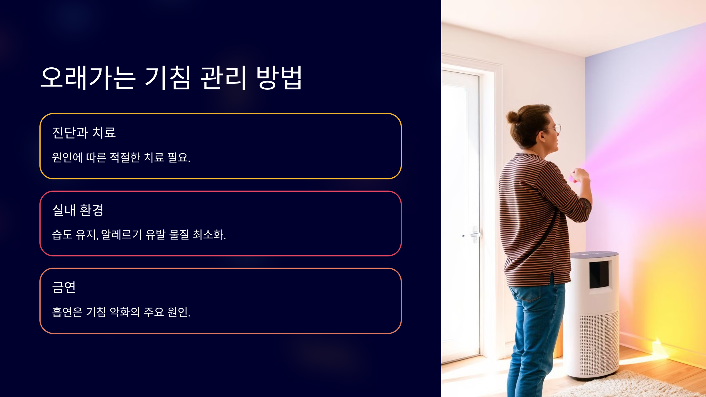 기침의 원인에 따라 적절한 치료를 받는 것이 중요합니다. 예를 들어, 천식이 원인이라면 흡입제를 사용하고, 역류성 식도염이라면 위산 억제제를 복용하는 등 원인에 맞춘 치료가 필요합니다.