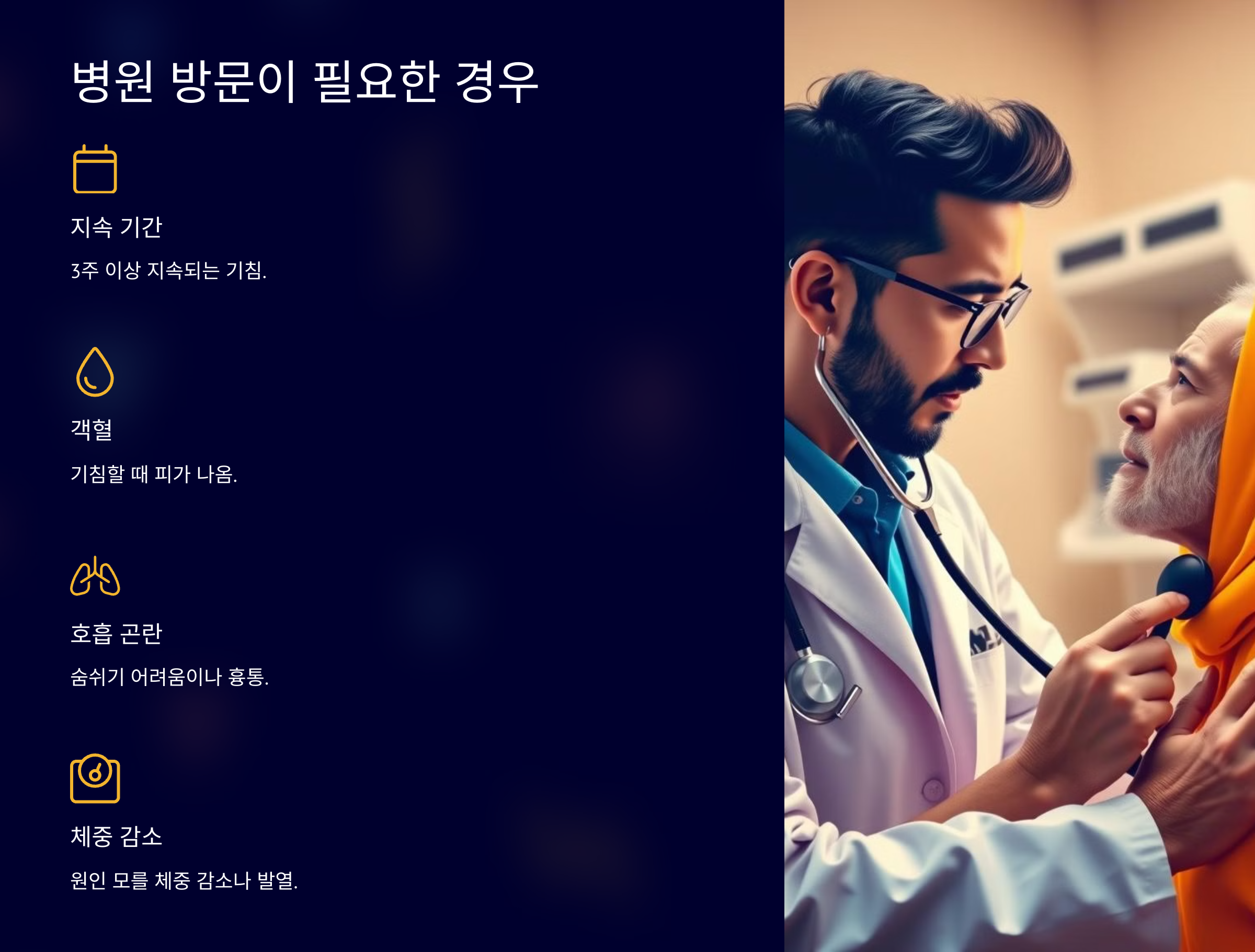 기침은 우리 몸의 중요한 방어 기전이지만, 동시에 폐 질환의 신호일 수 있습니다. 지속적인 기침이나 우려되는 증상이 있다면, 전문의 상담을 통해 정확한 원인을 파악하고 적절한 치료를 받는 것이 중요합니다. 건강한 생활 습관으로 폐 건강을 지키세요! 🫁💪