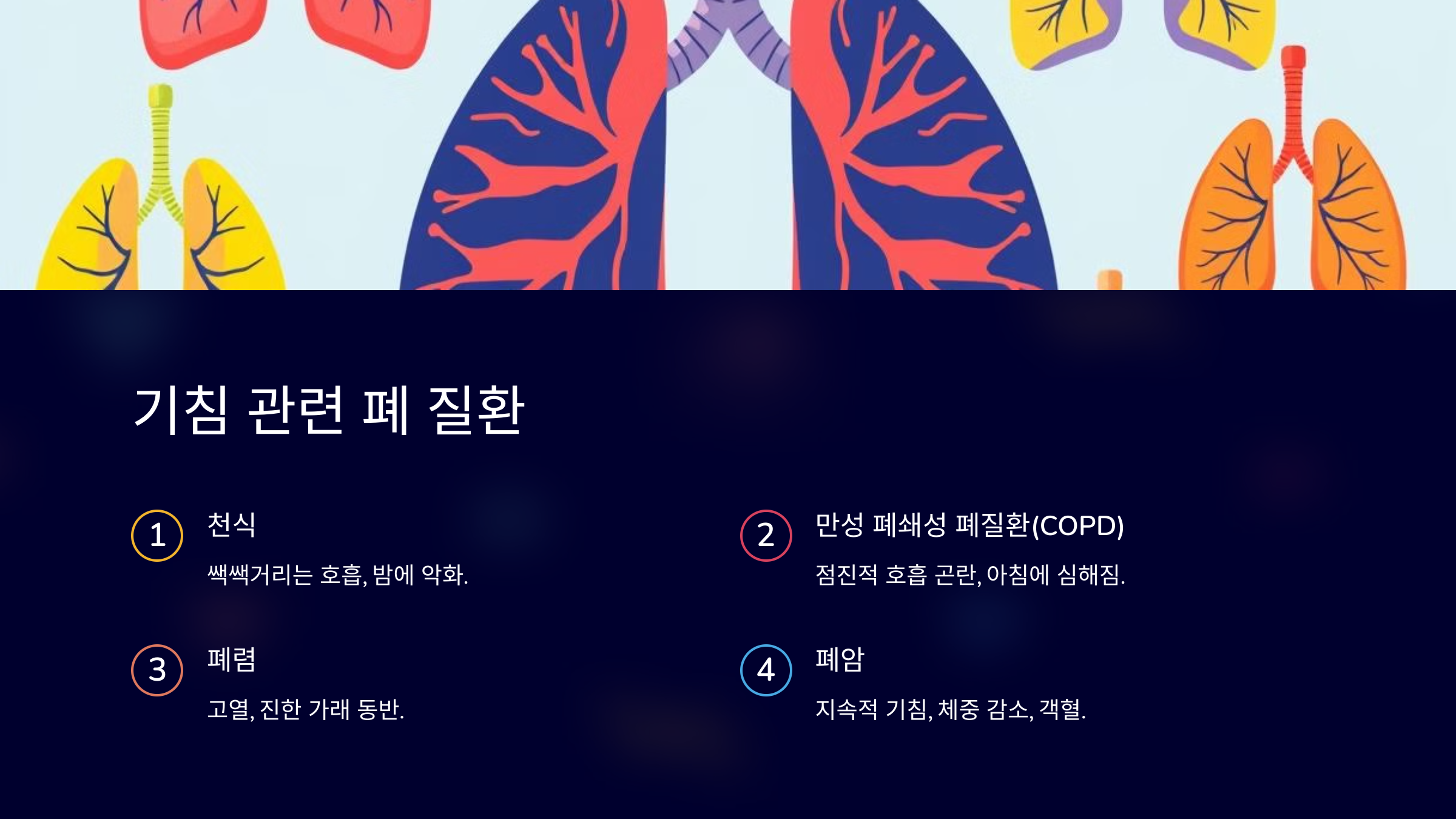 - 특징: 점진적인 호흡 곤란, 가래 동반