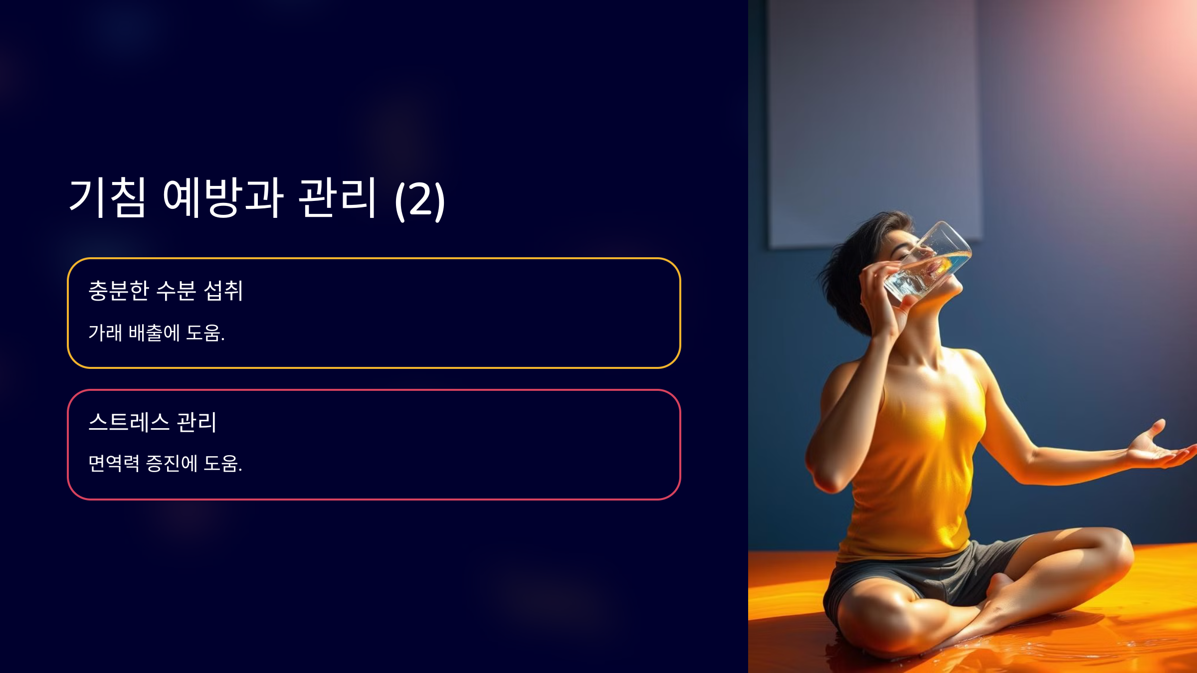 기침의 특성(건성/습성)과 지속 기간은 원인을 파악하는 데 중요한 단서가 됩니다.