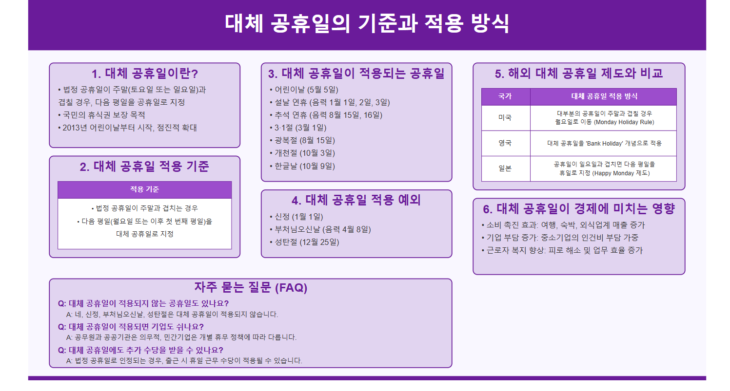 대체 공휴일은 ‘다음 평일’ 원칙을 따르므로, 기존 평일 휴무와는 별개로 적용됩니다.