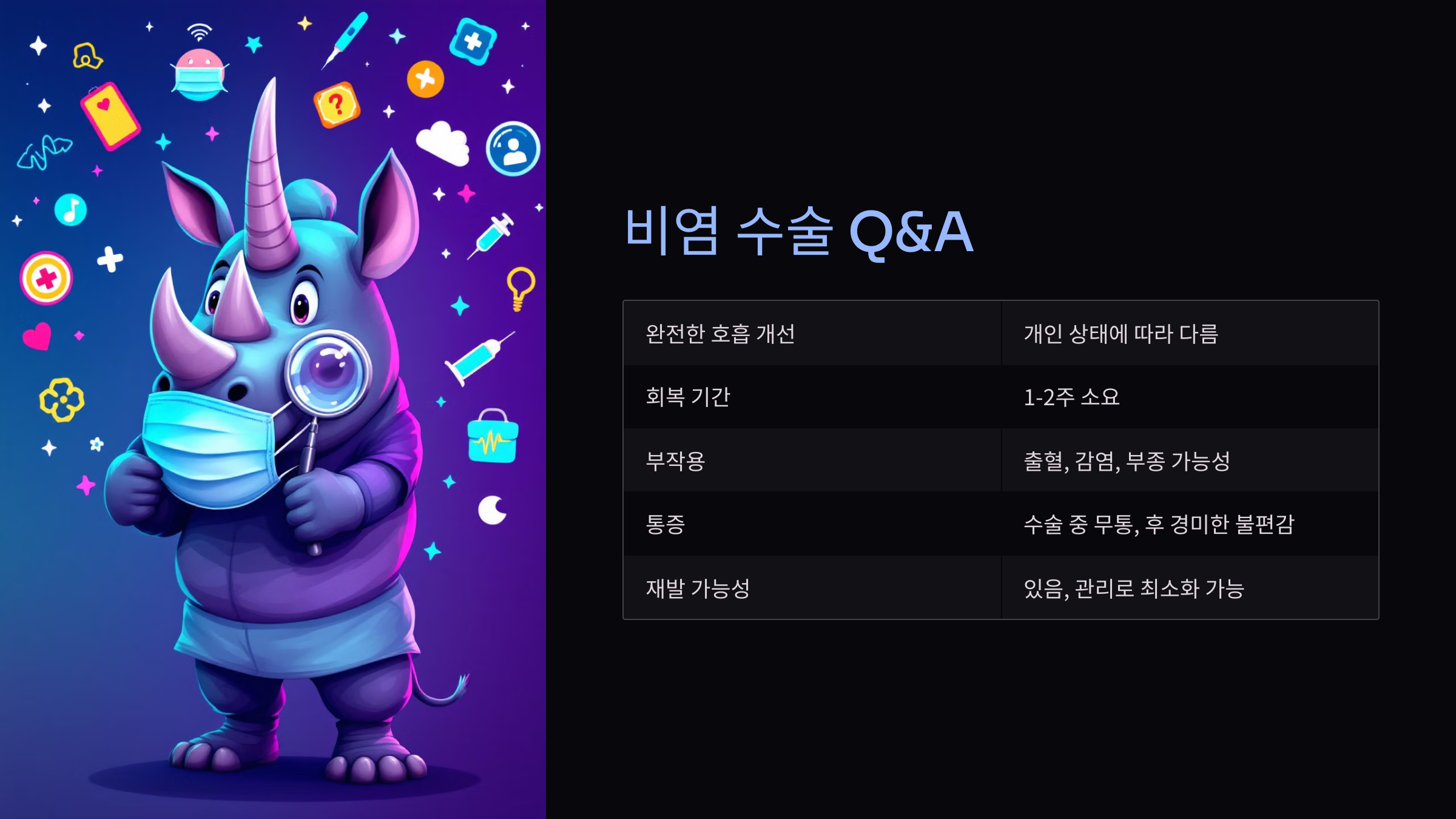 비염 수술 후 호흡이 개선되지만, 완전한 개선 여부는 개인의 상태에 따라 다릅니다. 수술 후 관리와 생활습관도 매우 중요합니다.