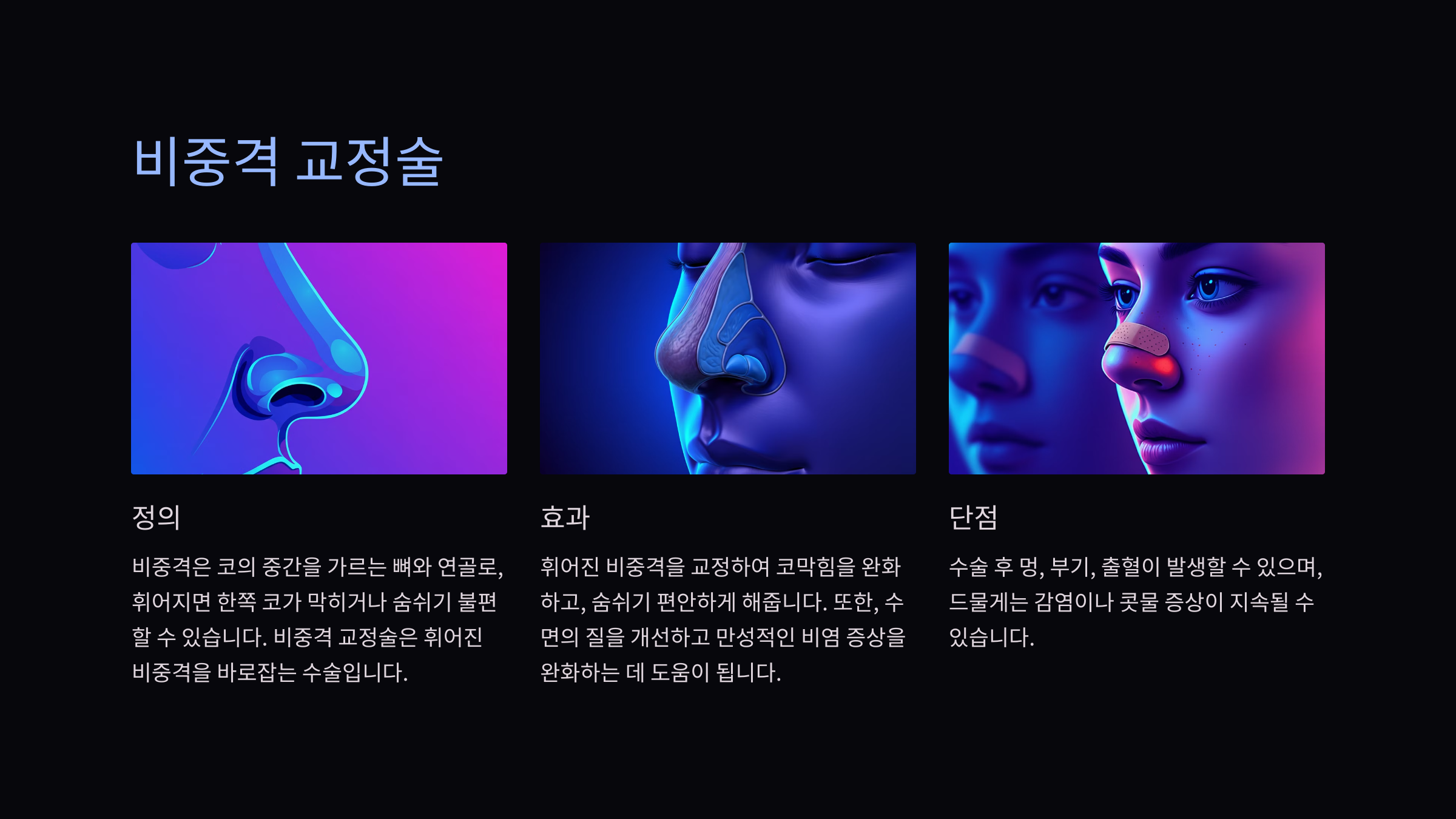 비중격은 코의 중앙을 가로지르는 연골과 뼈로 구성된 구조입니다. 이 구조가 휘어져 있으면 한쪽 코가 막히는 증상이 발생할 수 있습니다. 비중격 교정술은 이러한 휘어진 비중격을 교정하여 양쪽 코로 고르게 호흡할 수 있도록 하는 수술입니다.