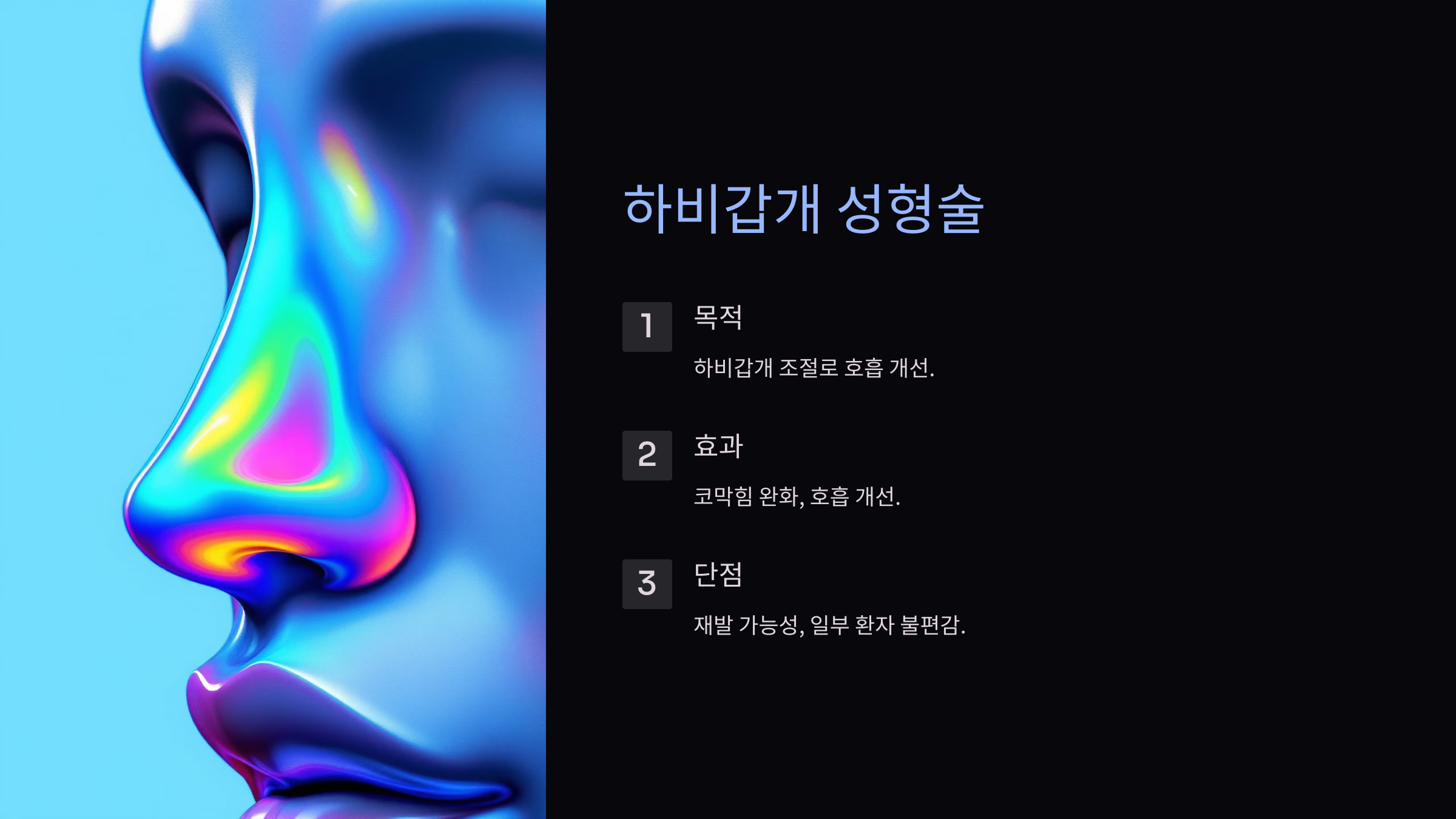 하비갑개 성형술은 비강 내부에 있는 하비갑개라는 구조물을 줄이거나 조절하여 호흡을 더 원활하게 하는 수술입니다. 하비갑개가 과도하게 커지면 코막힘이 발생할 수 있는데, 이를 해결하는 것이 이 수술의 목적입니다.