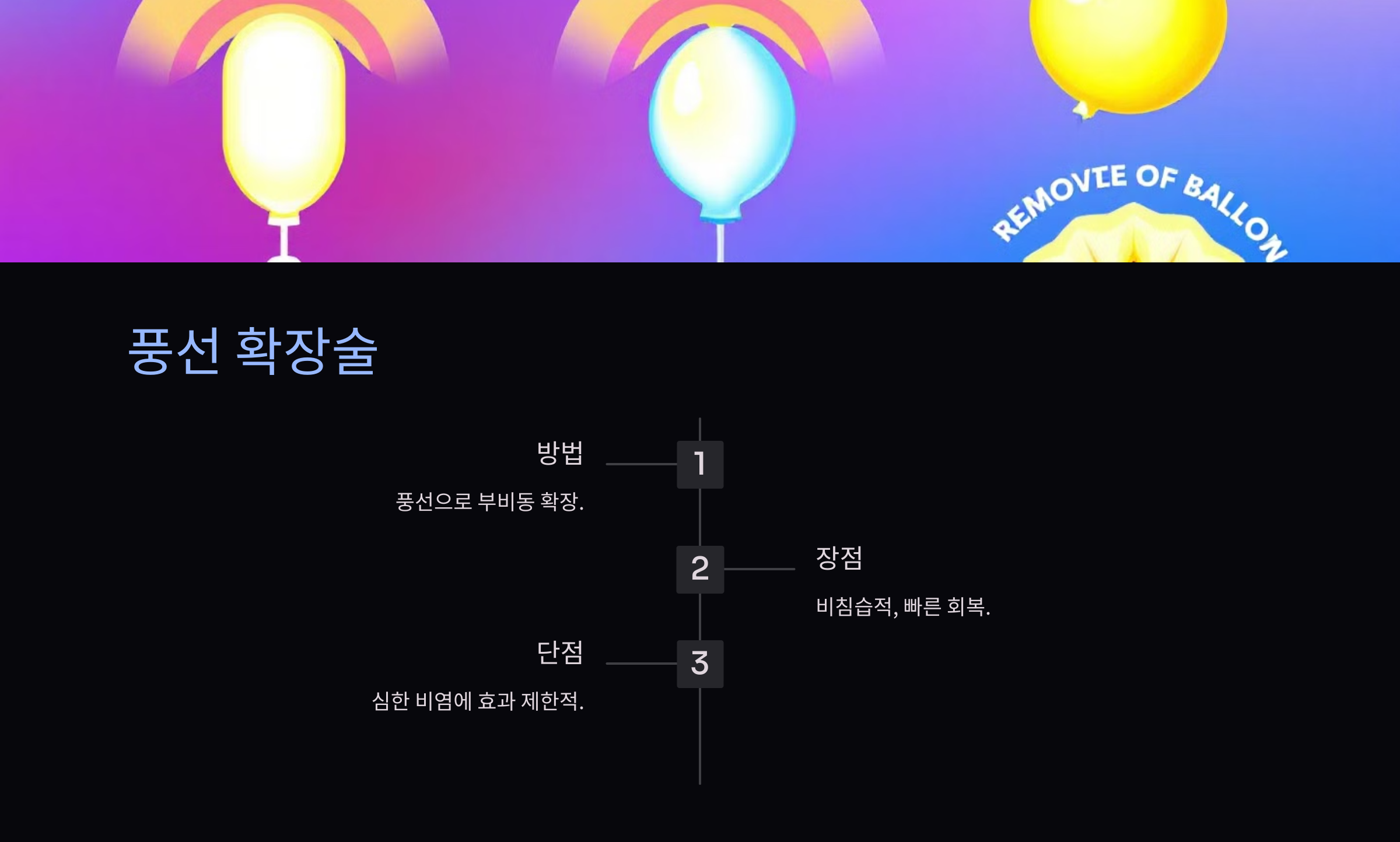 풍선 확장술은 부비동(코 주변의 빈 공간)이 막힌 환자에게 사용되는 최소 침습적 방법으로, 작은 풍선을 부비동 안에 삽입한 후 팽창시켜 막힌 부위를 넓히는 방법입니다. 부비동염(축농증)을 치료하는 데 매우 효과적입니다.