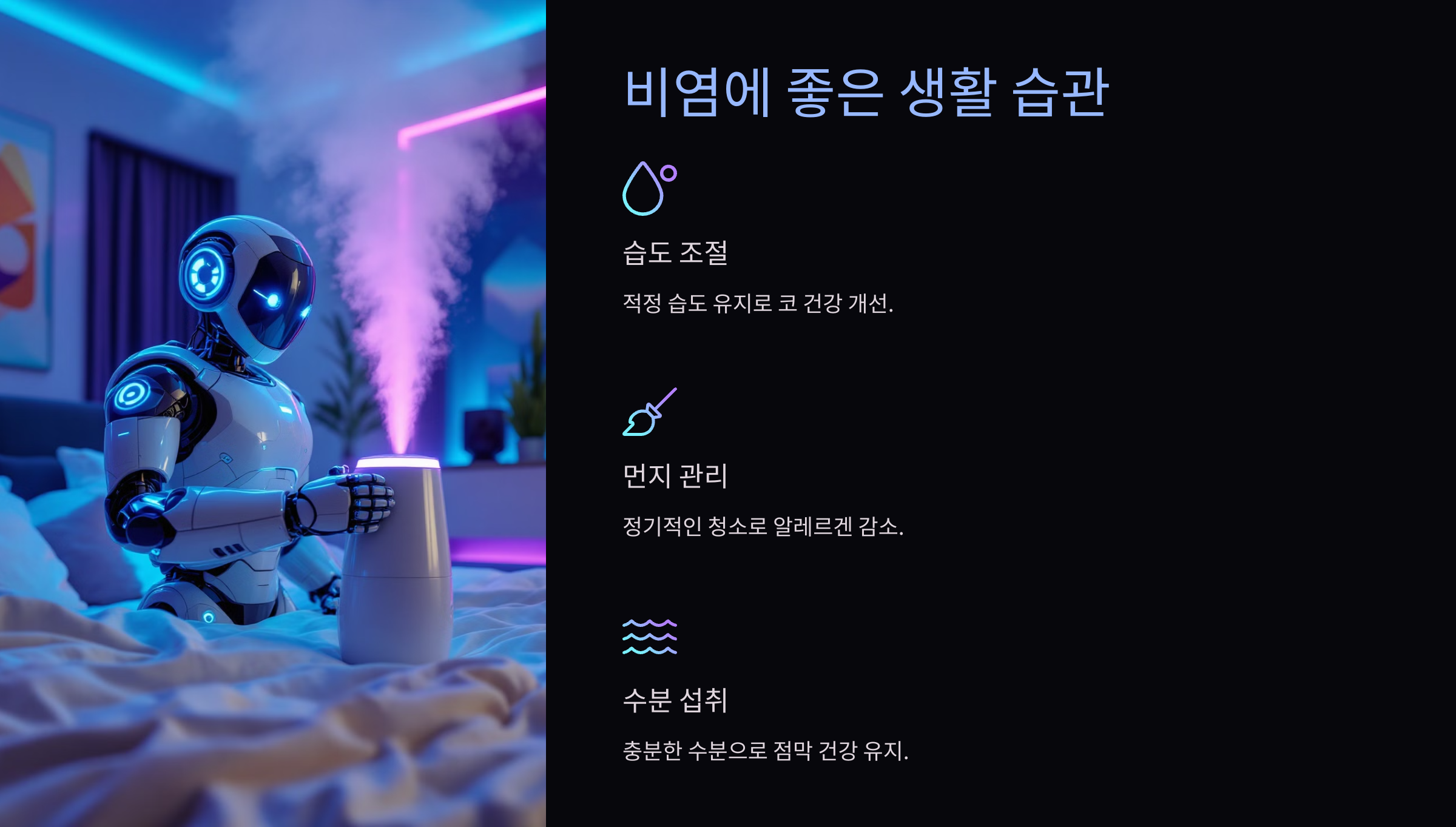 습도 조절, 먼지 관리, 충분한 수분 섭취, 그리고 적절한 휴식이 비염 증상 완화에 도움이 됩니다.