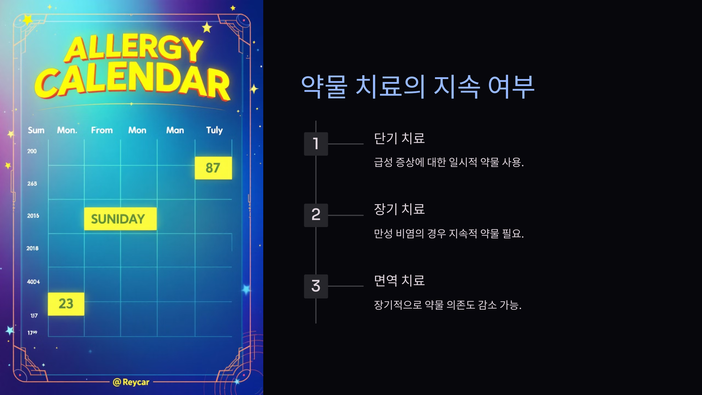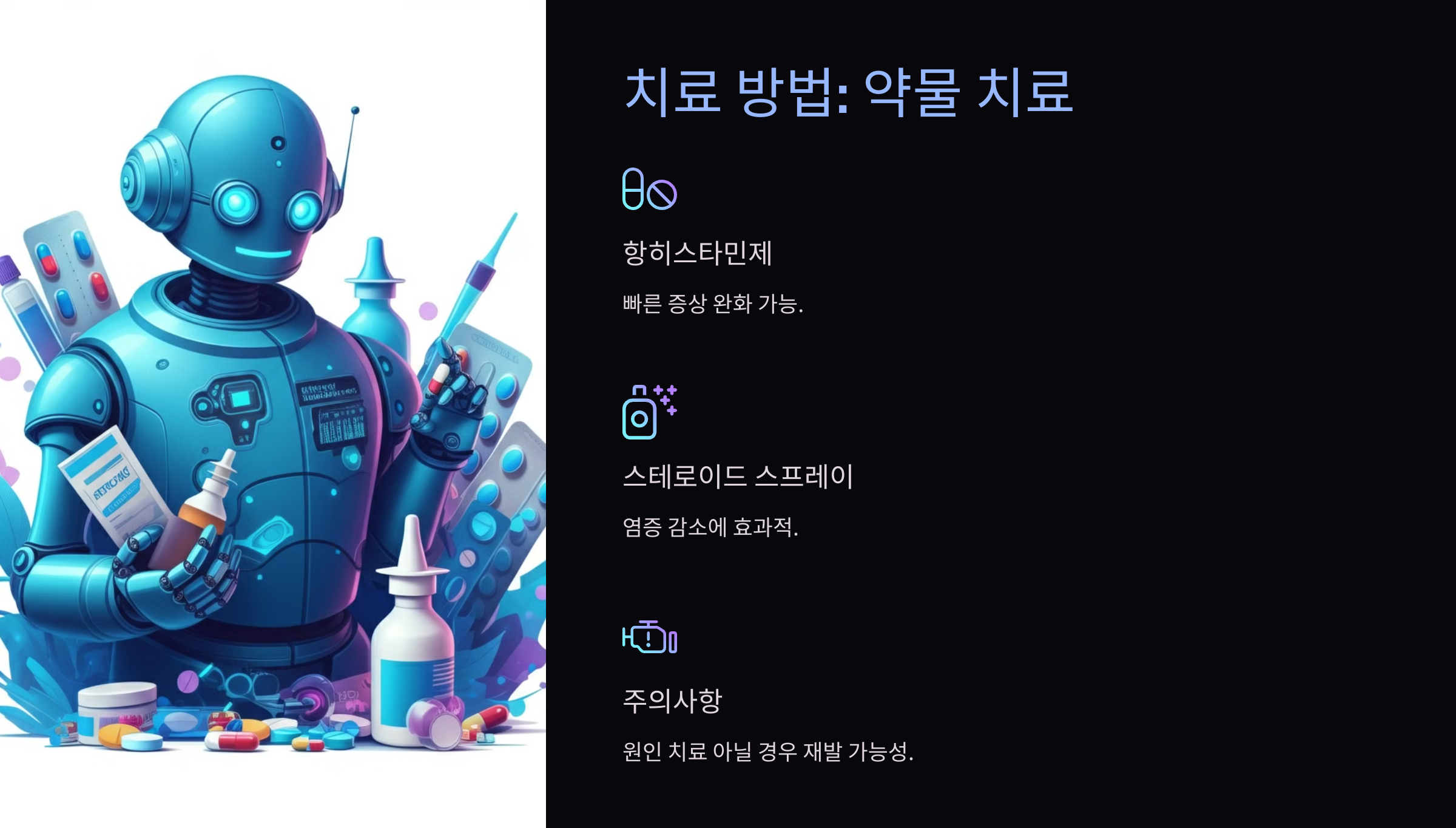- 약물 치료: 항히스타민제, 스테로이드 스프레이 등으로 빠른 증상 완화를 기대할 수 있지만, 원인 치료가 아닌 경우 증상이 재발할 가능성이 있습니다.