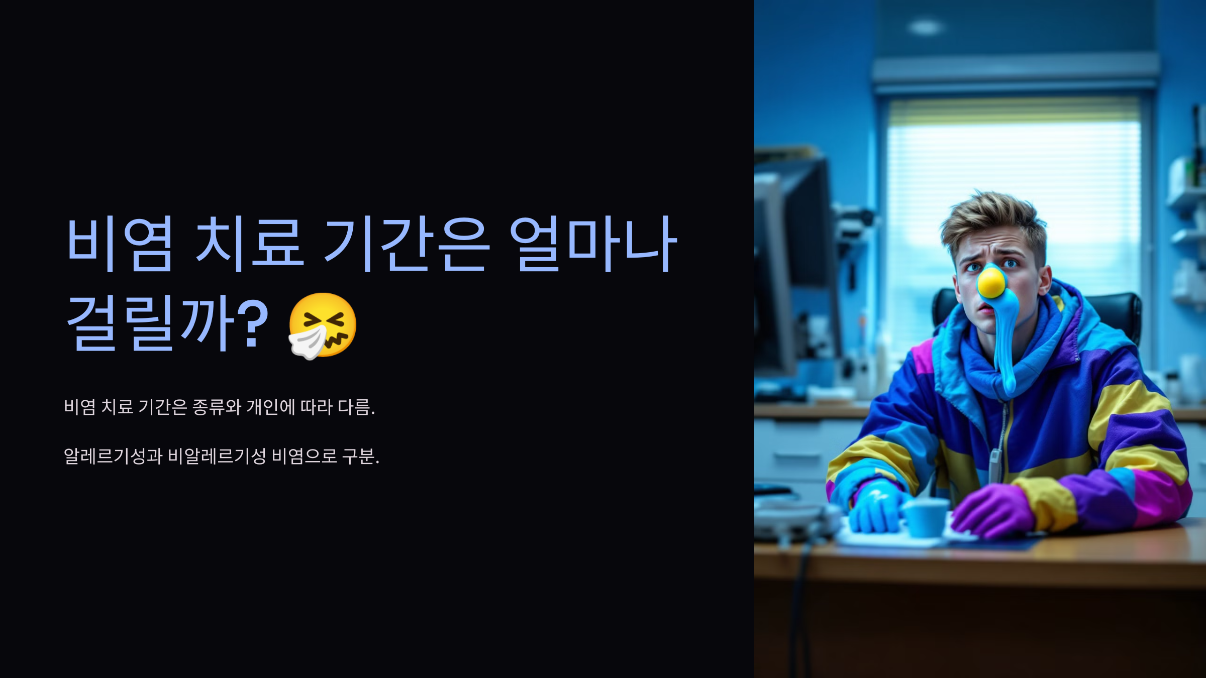 비염 치료 기간은 비염의 종류, 환자의 상태, 치료 방법 등에 따라 달라질 수 있습니다. 급성 비염은 보통 1-2주 내에 호전될 수 있지만, 만성 비염이나 알레르기성 비염은 몇 달에서 몇 년까지 지속적인 관리가 필요할 수 있습니다. 가장 중요한 것은 꾸준한 치료와 생활습관 관리입니다. 전문가의 진단을 통해 적절한 치료 계획을 세우고, 꾸준히 관리하는 것이 비염 완치의 핵심입니다.