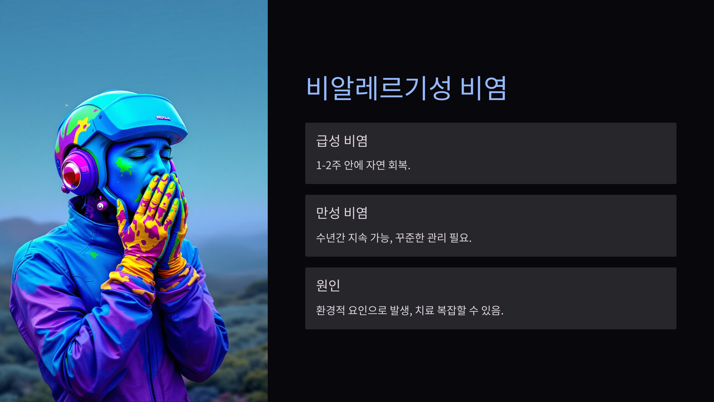 • 급성 비염: 감기나 독감 등 감염으로 인한 급성 비염은 대개 1-2주 안에 자연적으로 회복됩니다. 이 기간 동안은 충분한 휴식과 수분 섭취가 중요합니다.