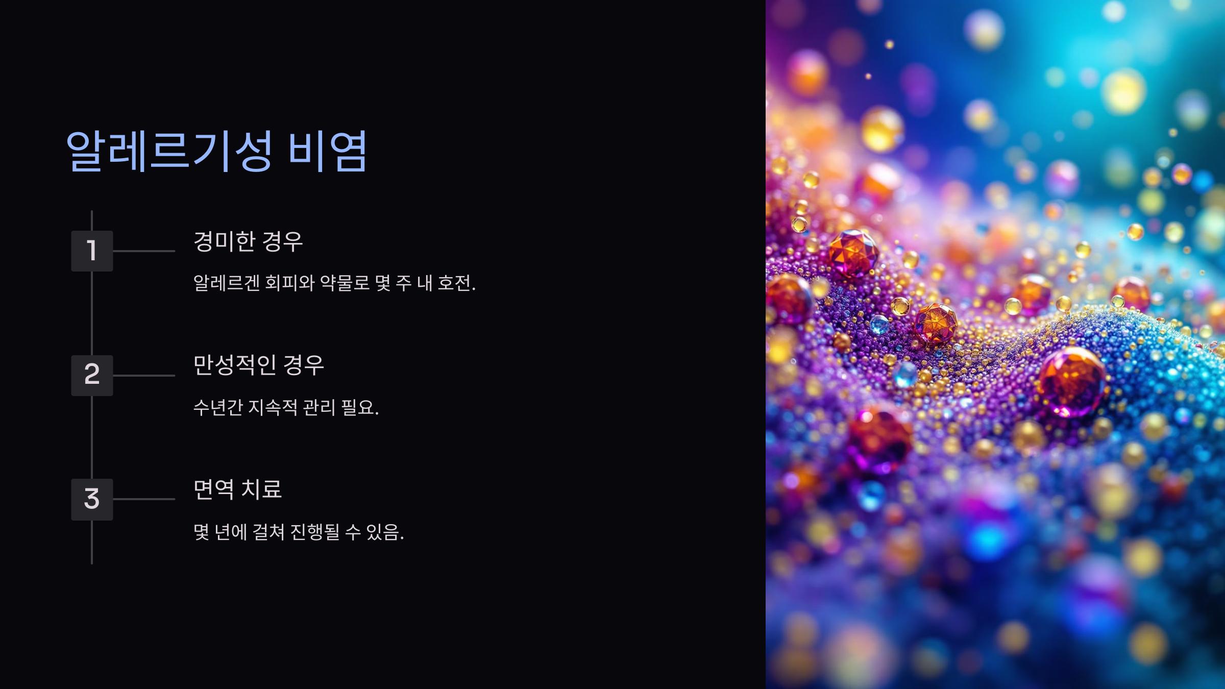 - 경미한 경우: 증상이 경미한 알레르기성 비염은 알레르겐 회피와 항히스타민제 복용으로 몇 주 내로 호전될 수 있습니다.