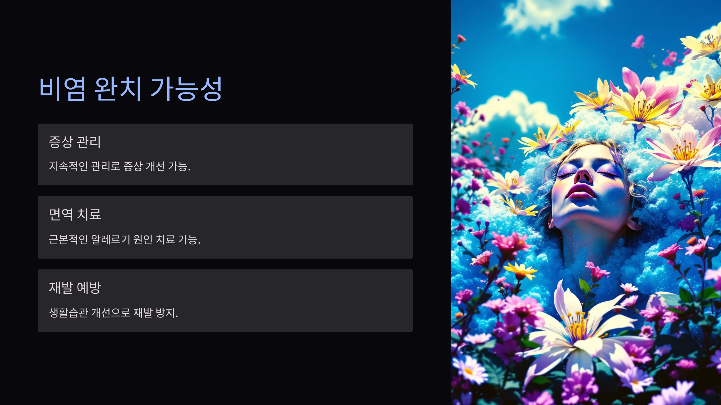 비염은 완치가 어려울 수 있지만, 증상 관리와 면역 치료 등을 통해 증상을 크게 개선하고 재발을 예방할 수 있습니다.