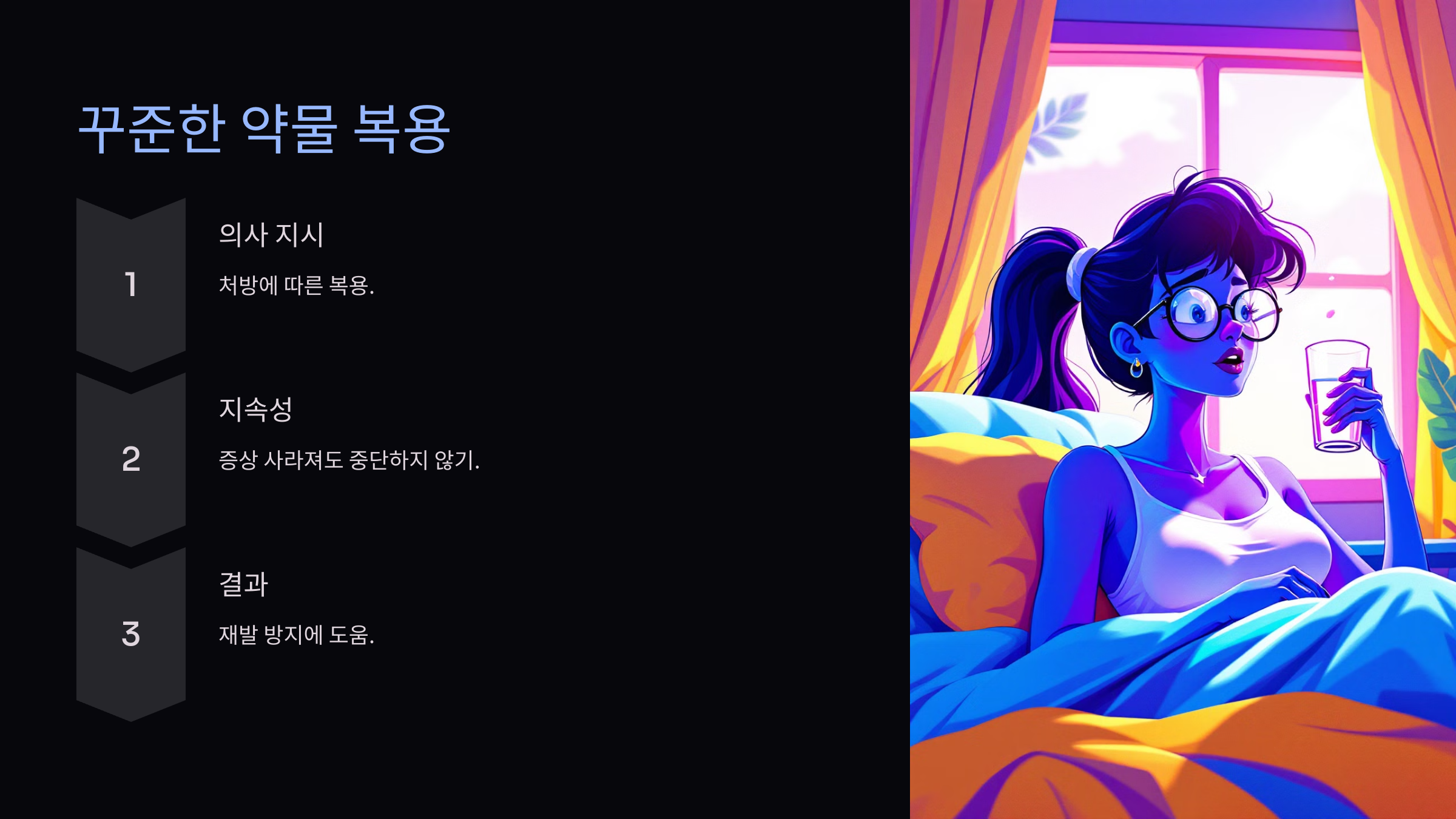 증상이 사라졌다고 해서 약물 복용을 중단하는 것은 재발의 원인이 될 수 있습니다. 의사의 지시에 따라 꾸준히 치료를 이어가는 것이 중요합니다.