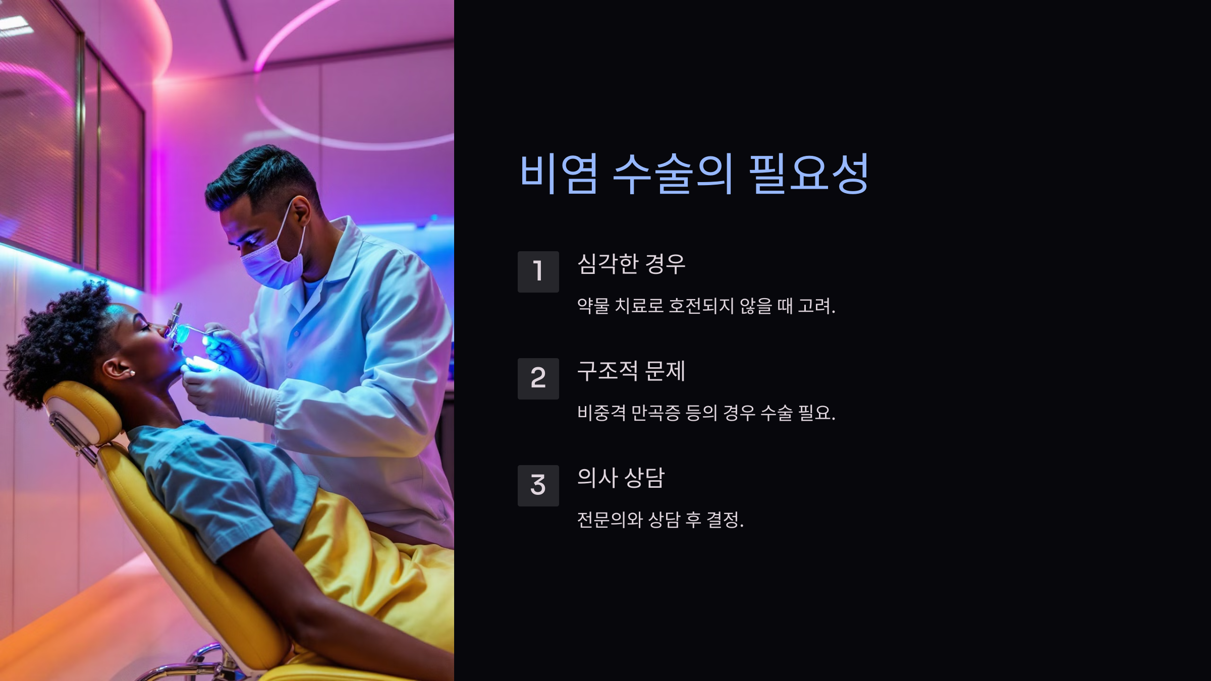 수술은 보통 비염이 매우 심한 경우에만 추천됩니다. 일반적으로는 약물 치료와 면역 치료가 먼저 시행됩니다.