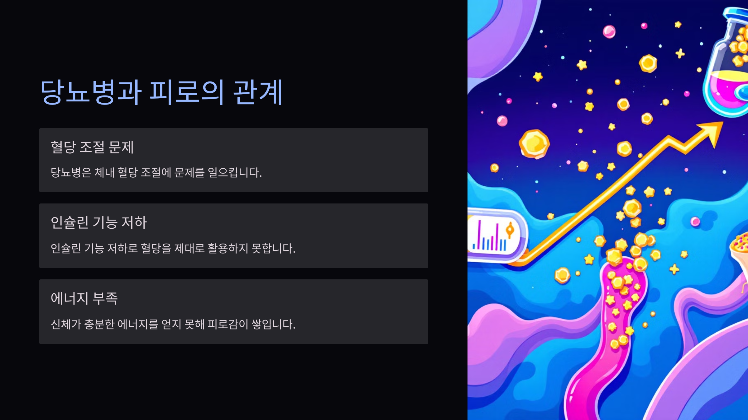 당뇨병은 체내의 혈당 조절에 문제가 생기는 질환입니다. 신체는 에너지원으로 혈당을 사용하지만, 당뇨병이 있을 경우 인슐린 기능이 저하되어 혈당을 제대로 활용하지 못합니다. 그 결과 신체는 충분한 에너지를 얻지 못하고 피로감이 쌓이게 됩니다.