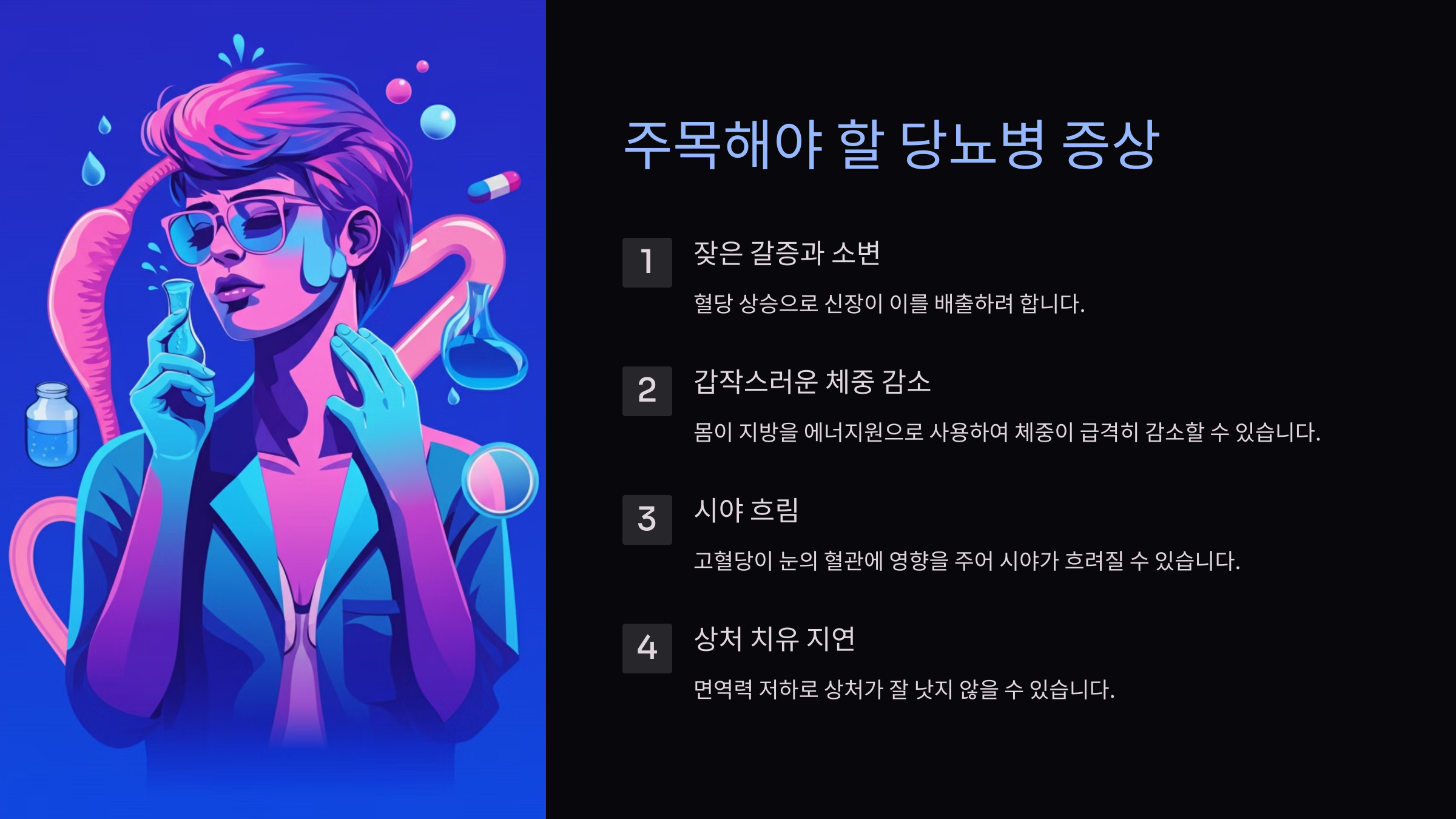 - 잦은 갈증과 소변: 혈당이 높아지면 신장이 이를 배출하려는 과정을 겪으면서 갈증과 잦은 소변이 발생할 수 있습니다.