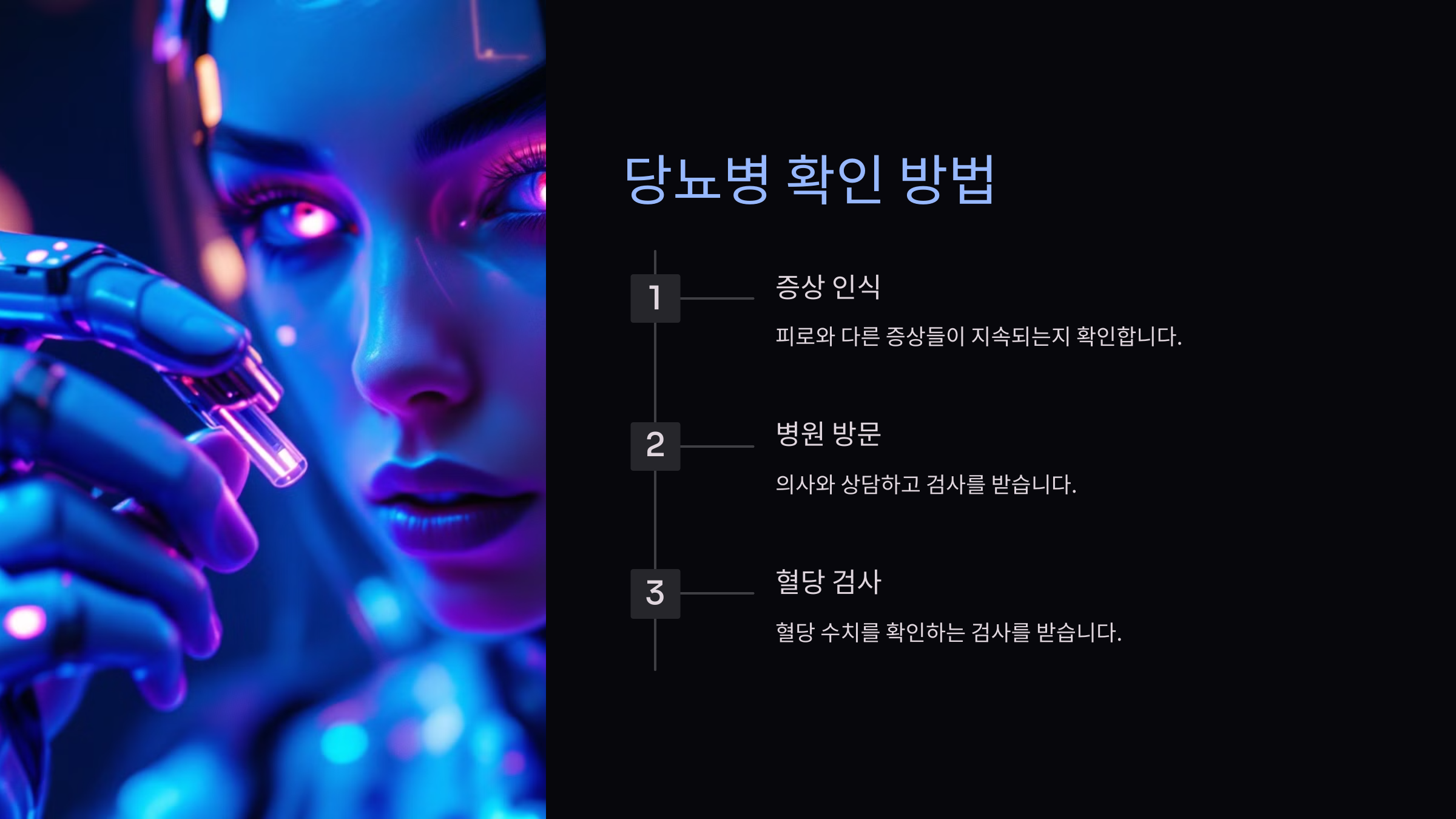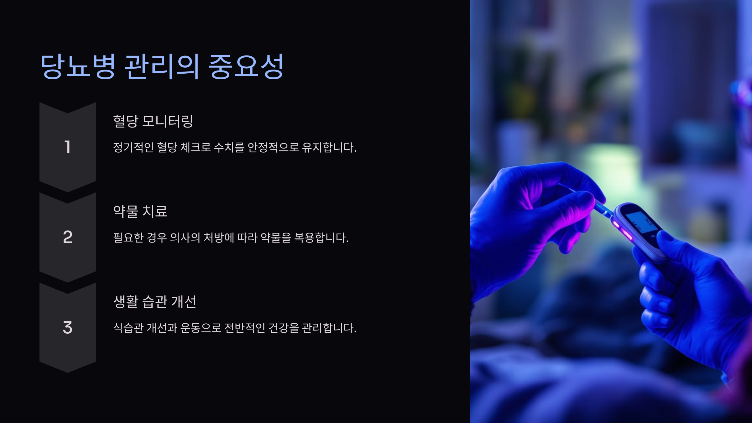 만약 위와 같은 증상이 동반되거나 피로가 지속적으로 이어진다면, 병원에서 혈당 검사를 받아보는 것이 필요합니다. 당뇨병은 조기 발견이 중요하므로, 피로가 만성적으로 느껴질 때는 단순히 생활 패턴의 문제로만 치부하지 않는 것이 좋습니다.