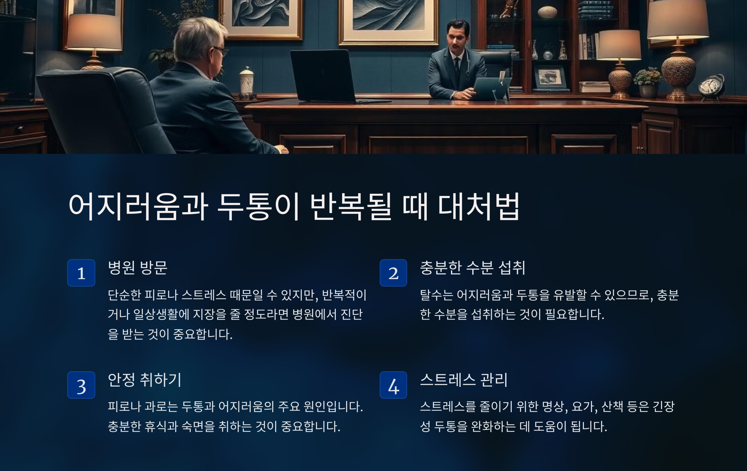 - 안정 취하기: 피로나 과로는 두통과 어지러움의 주요 원인입니다. 충분한 휴식과 숙면을 취해야 합니다.