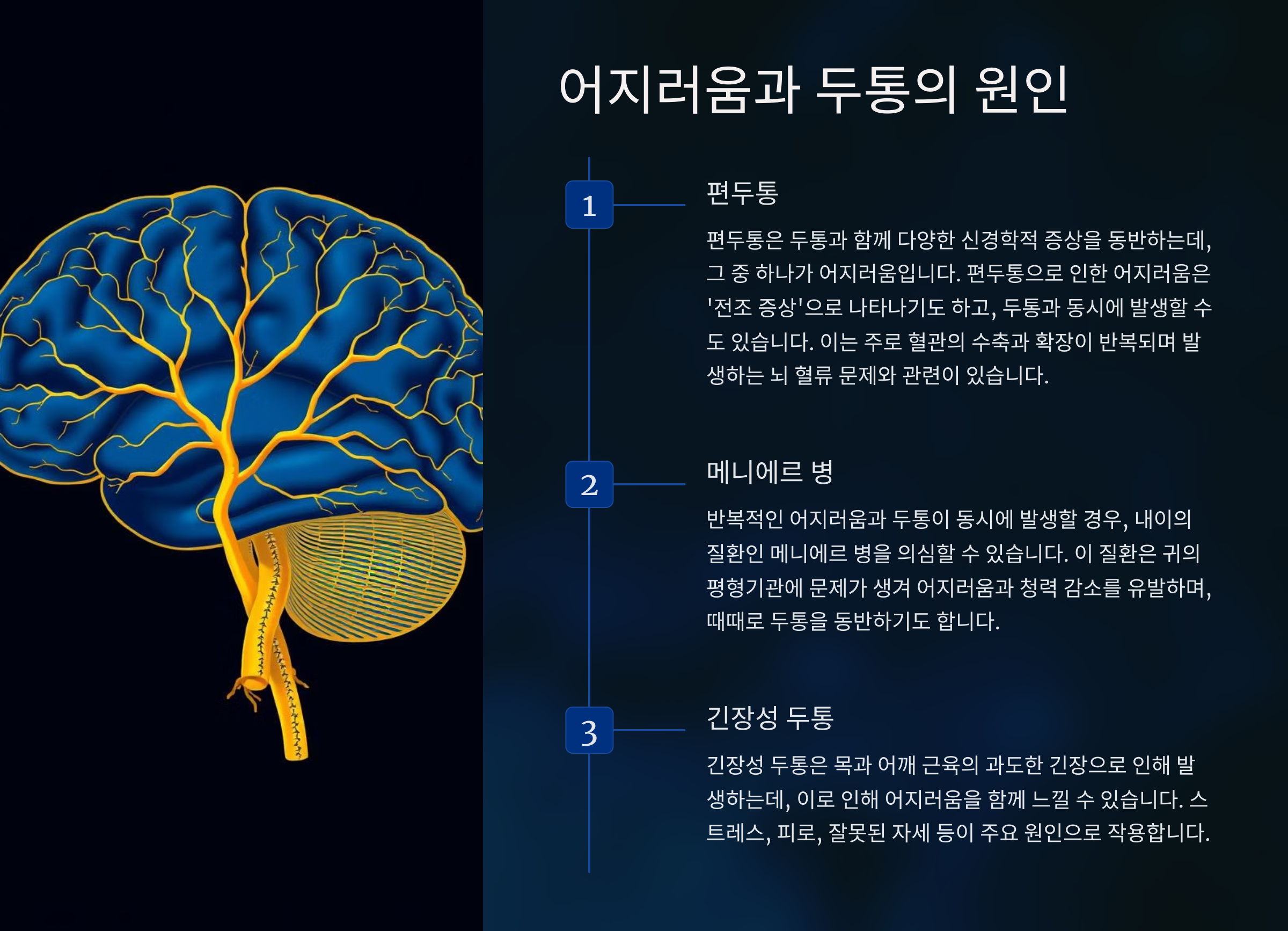 어지러움이 반복된다면 단순한 두통일 수도 있지만, 다른 신체적이나 신경학적인 문제가 있을 수도 있습니다. 증상이 계속된다면 정확한 진단을 위해 병원을 방문하는 것이 가장 안전합니다.