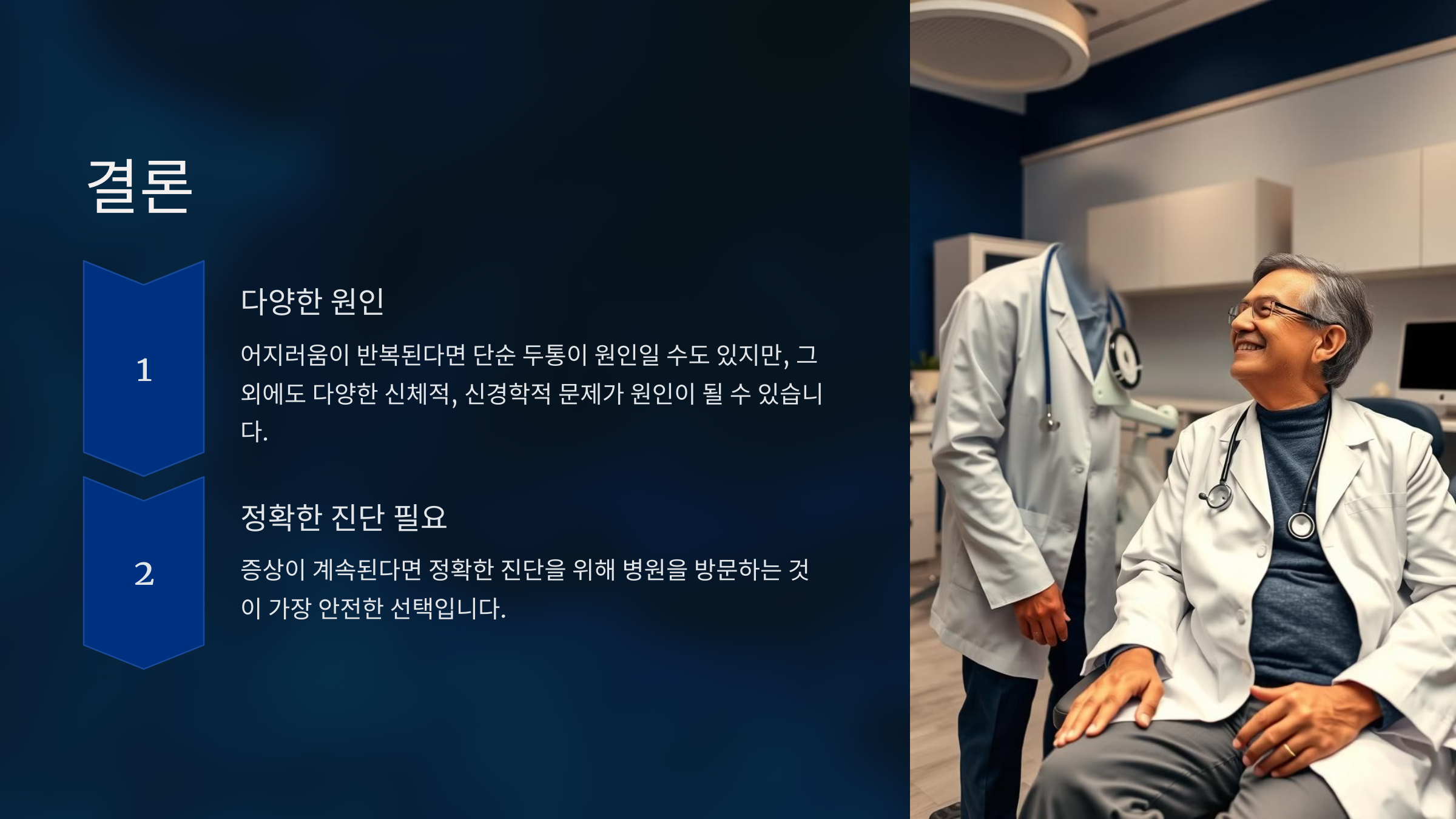 가장 심각한 경우는 뇌의 혈관 문제나 종양 같은 신경학적 질환입니다. 이런 경우 어지러움과 두통 외에도 발음 문제, 시야 장애, 마비 같은 증상이 나타날 수 있습니다.