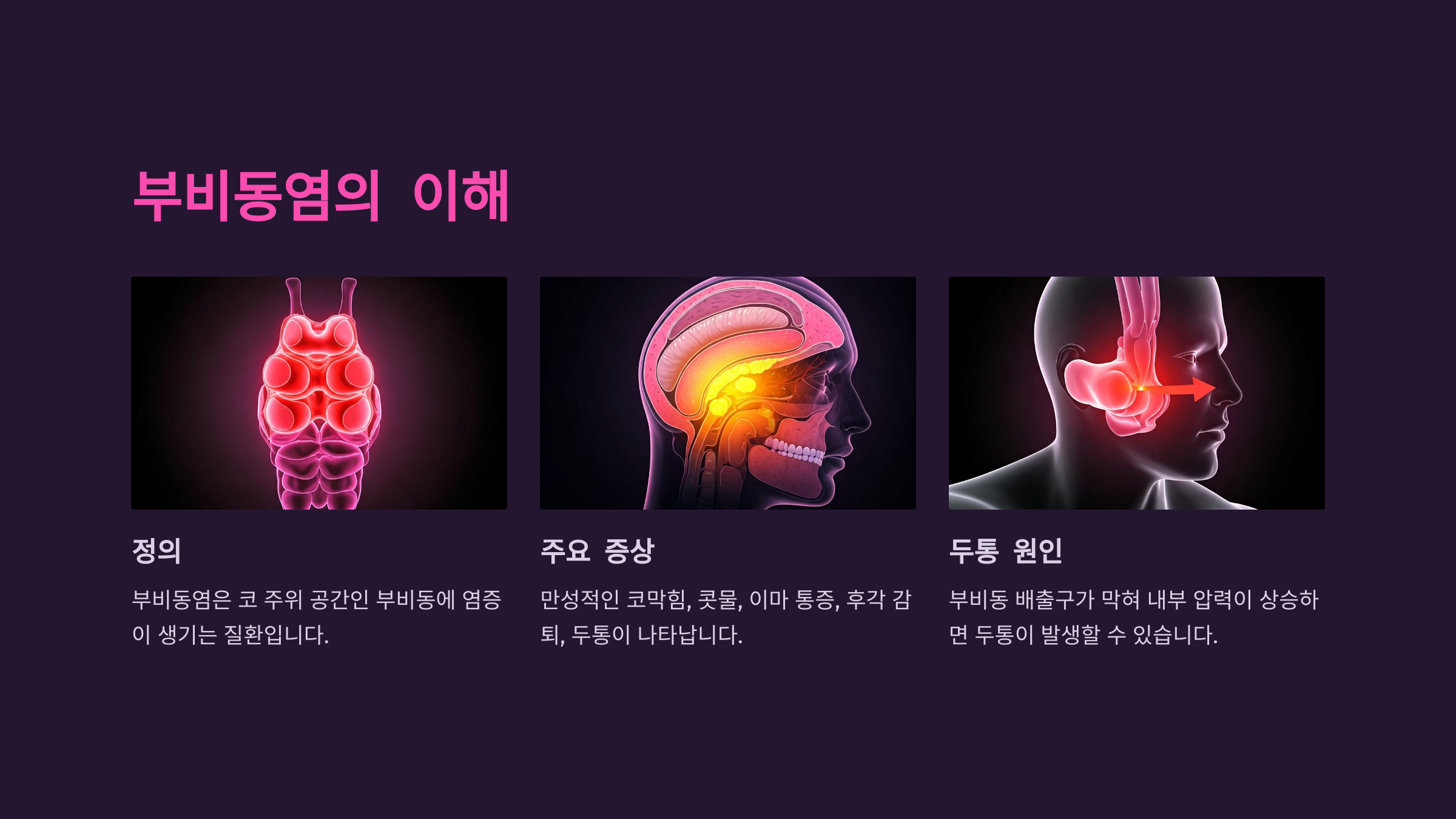부비동염(Sinusitis)은 부비동에 염증이 생기는 질환으로, 코막힘과 두통의 주요 원인 중 하나입니다. 부비동은 코 주위에 위치한 공기가 가득 찬 공간으로, 염증이 발생하면 이곳에 점액이 쌓여 압박감과 통증을 유발합니다.