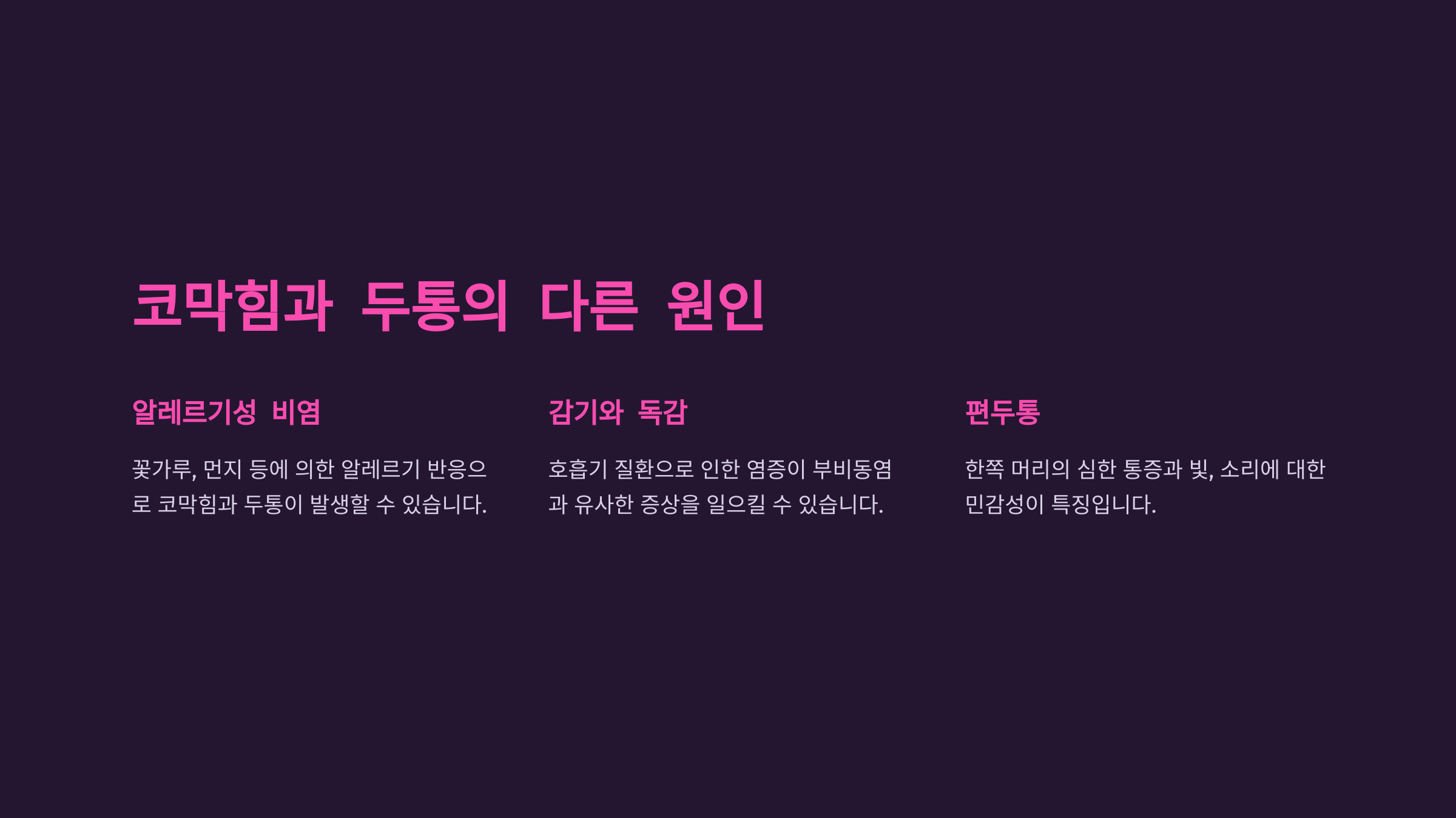 - 편두통: 코막힘 없이 두통만 주로 발생하는 경우, 부비동염보다는 편두통일 가능성이 높습니다. 특히, 편두통은 한쪽 머리에서 심한 통증이 느껴지고, 빛이나 소리에 민감해지는 증상이 특징입니다.