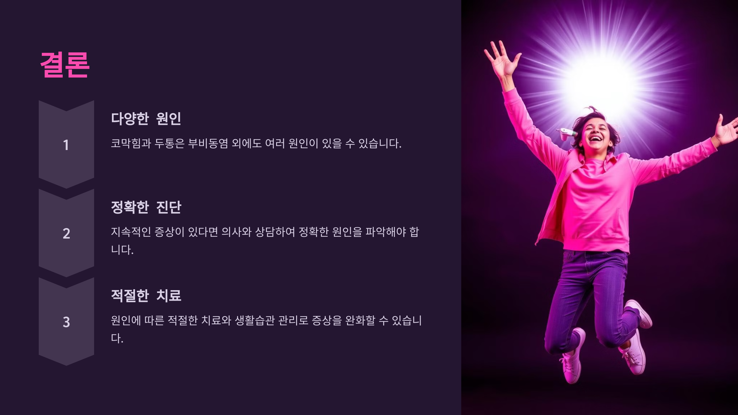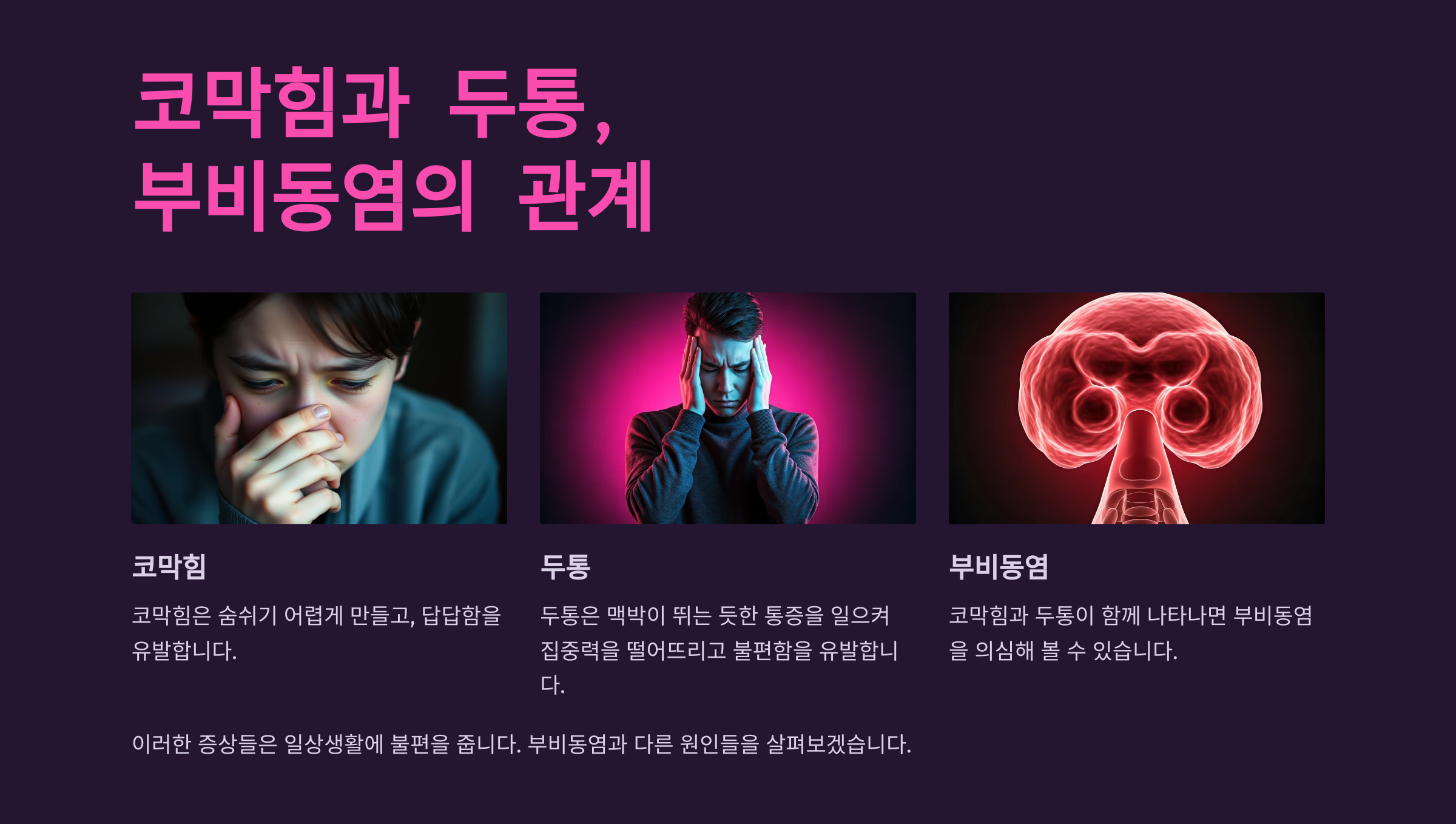 코막힘과 두통은 다양한 원인에 의해 발생할 수 있으며, 그 중 부비동염은 주요 원인 중 하나입니다. 그러나 알레르기, 감기, 편두통 등 다른 원인들도 비슷한 증상을 유발할 수 있기 때문에 정확한 진단이 필요합니다. 만약 부비동염이 원인이라면 적절한 치료와 생활습관 관리로 증상을 완화할 수 있습니다. 따라서 증상이 지속된다면, 의사와 상담하여 정확한 원인을 파악하고 치료하는 것이 중요합니다.