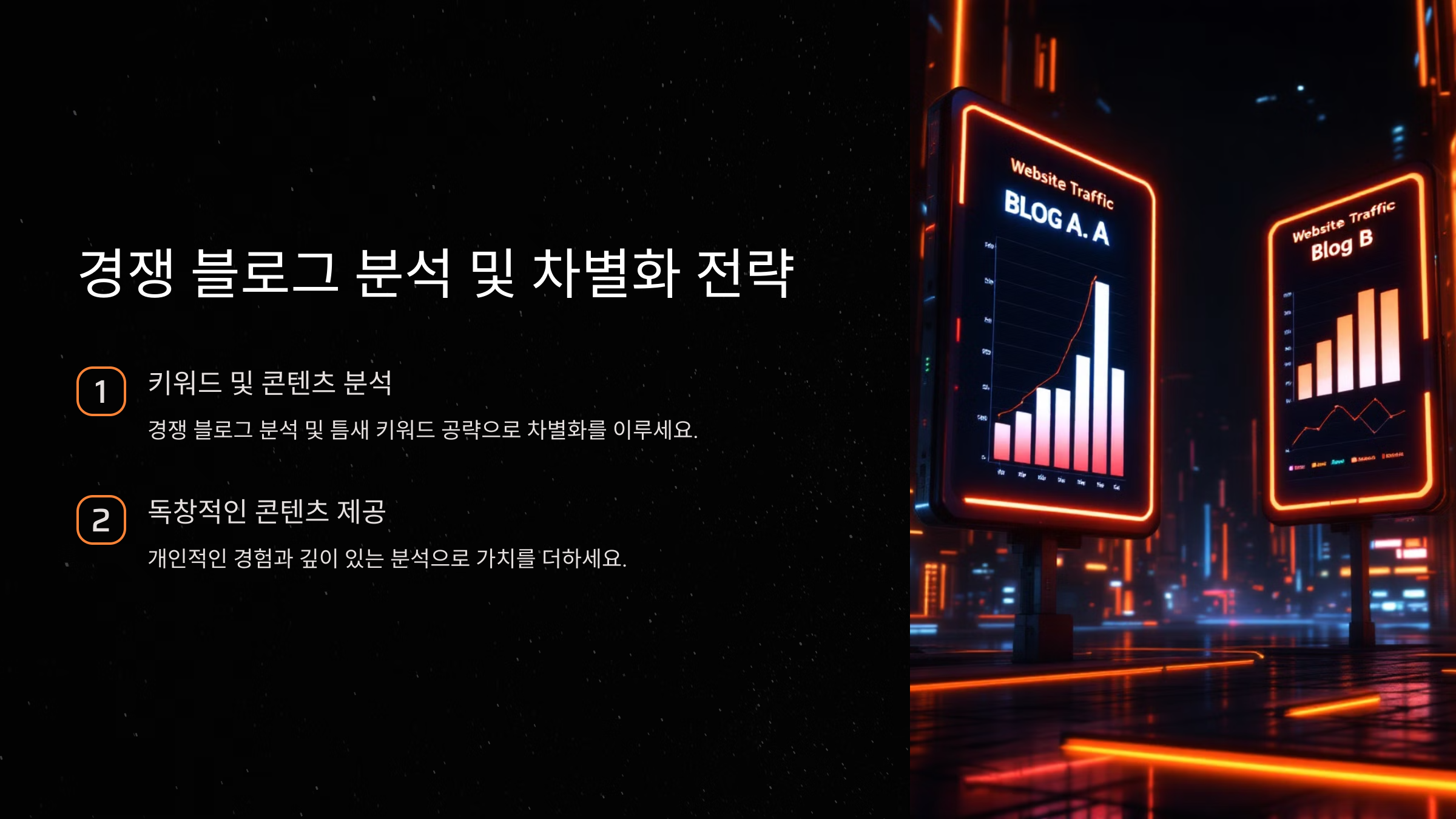 경쟁 블로그와는 다른 독창적인 콘텐츠를 제공하는 것이 중요합니다. 예를 들어, 경쟁 블로그가 단순한 정보 제공에 그친다면, 개인적인 경험을 담은 콘텐츠를 작성하거나, 더 깊이 있는 분석을 제공하여 차별화된 가치를 전달하세요.