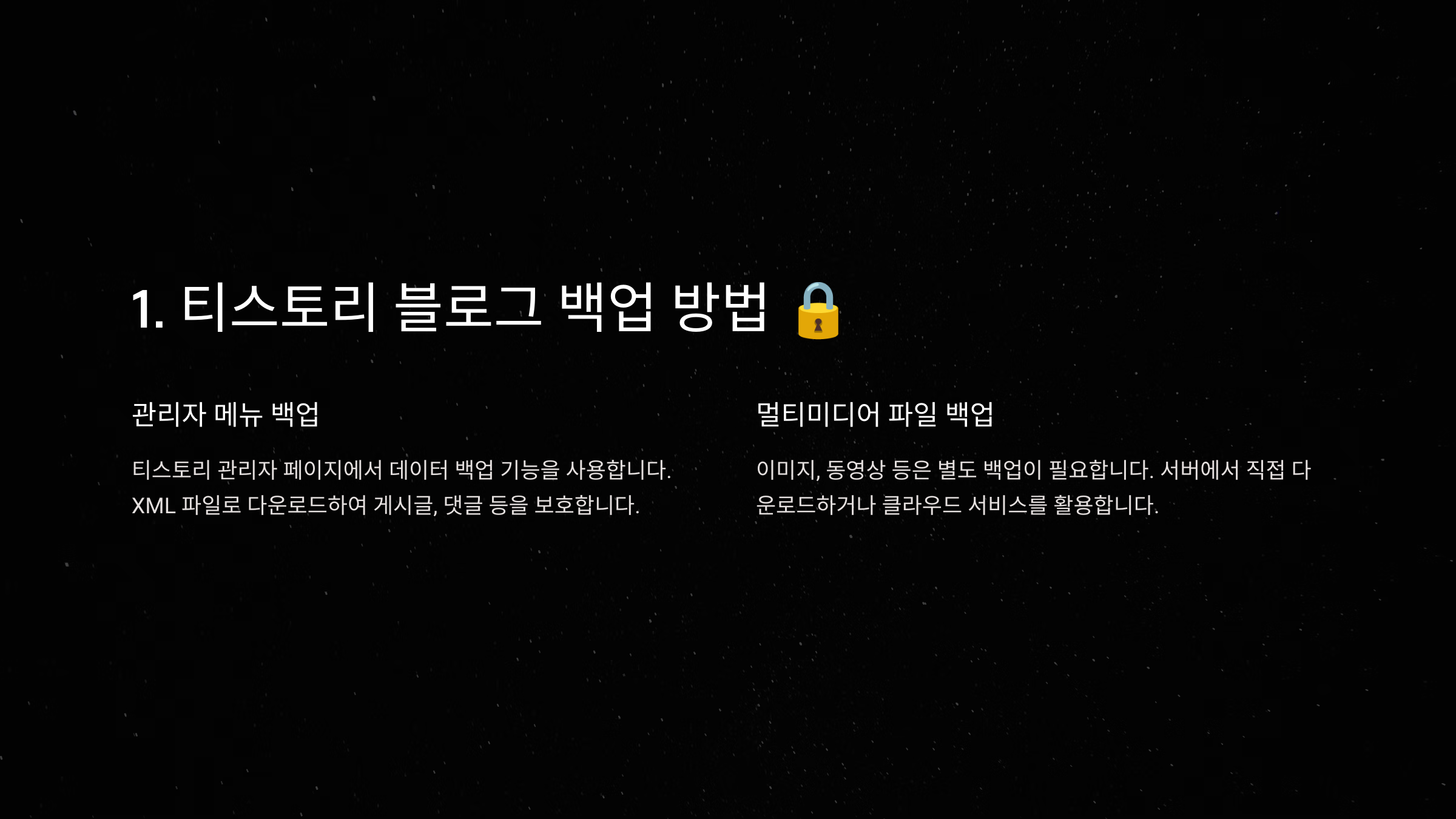 티스토리 백업 기능은 게시글과 댓글 데이터를 포함하지만, 이미지나 동영상 등의 멀티미디어 파일은 포함되지 않습니다. 이러한 파일은 별도로 백업해야 안전합니다.