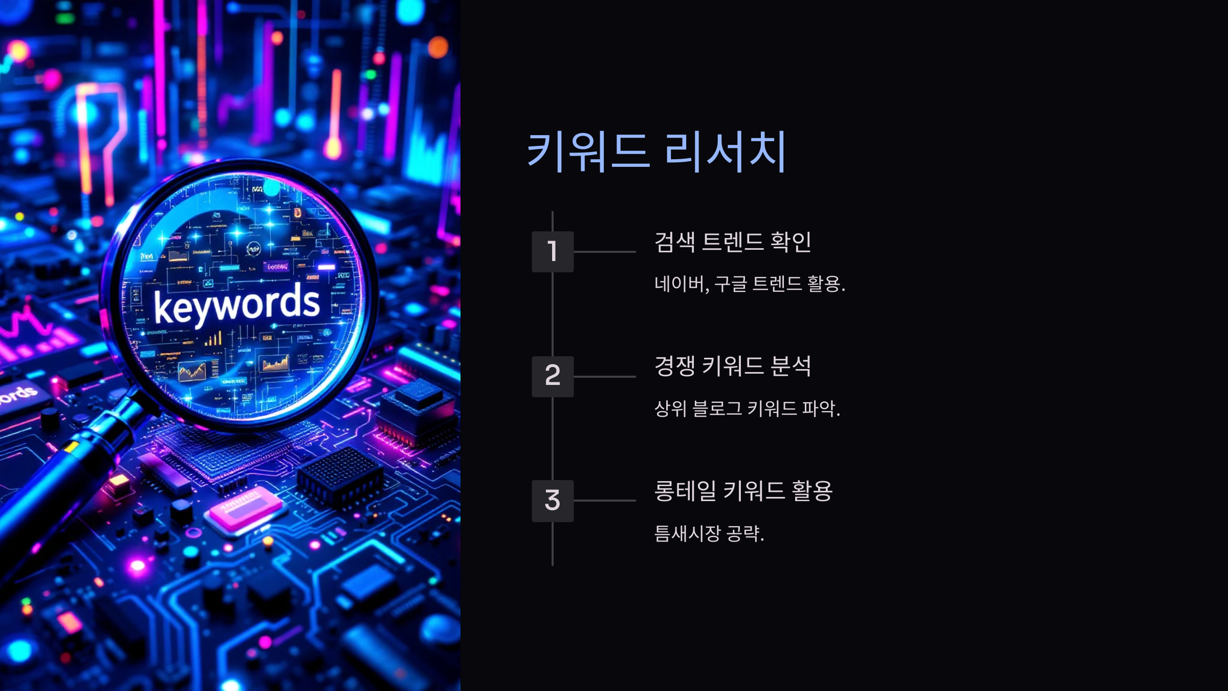 1. 검색 트렌드 확인: 네이버 키워드 도구나 구글 트렌드 같은 도구를 사용하여 인기 있는 검색어를 확인합니다.