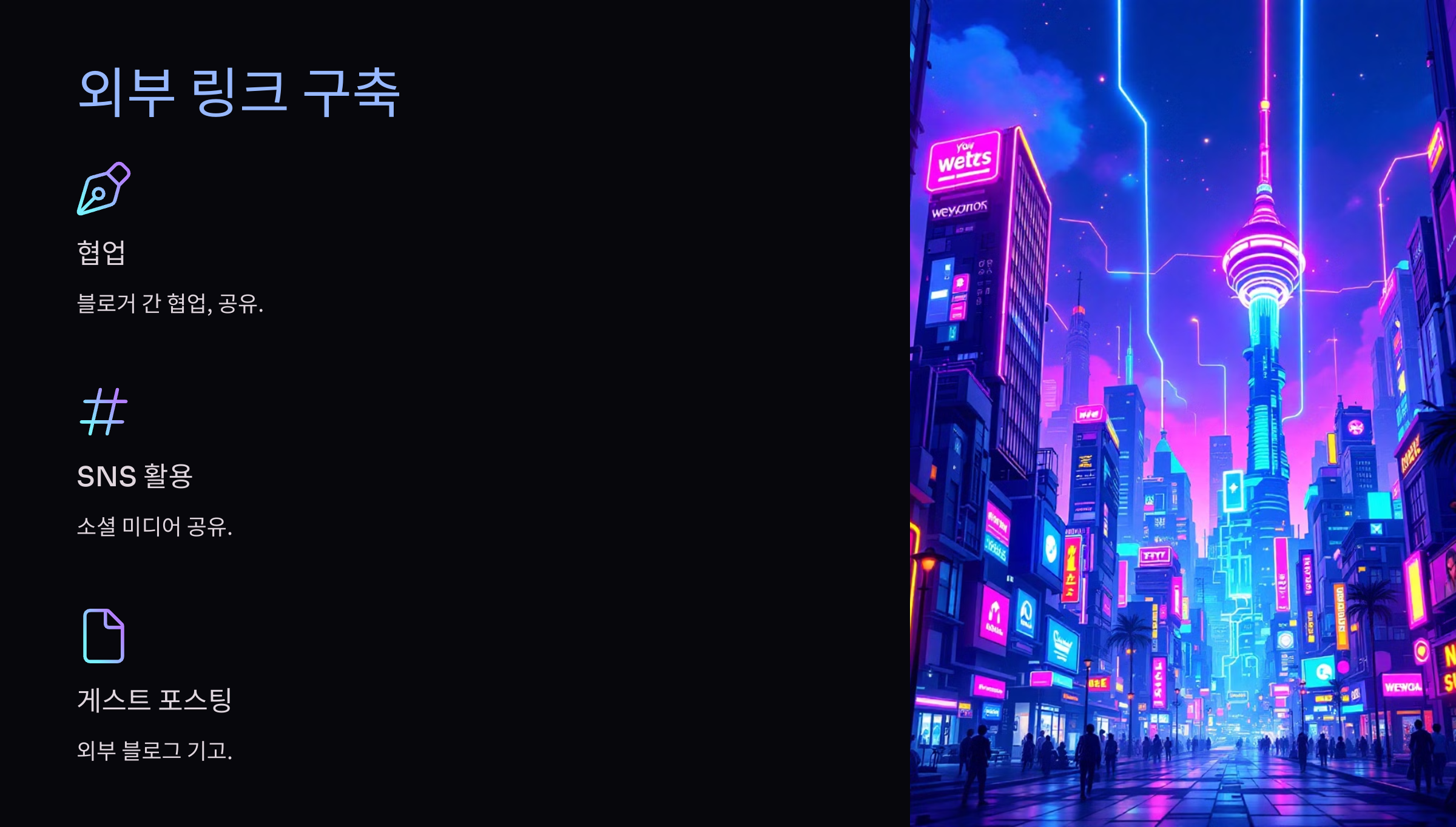 • SNS 활용: 블로그 글을 다양한 소셜미디어에 공유해 외부 링크를 만들어보세요.