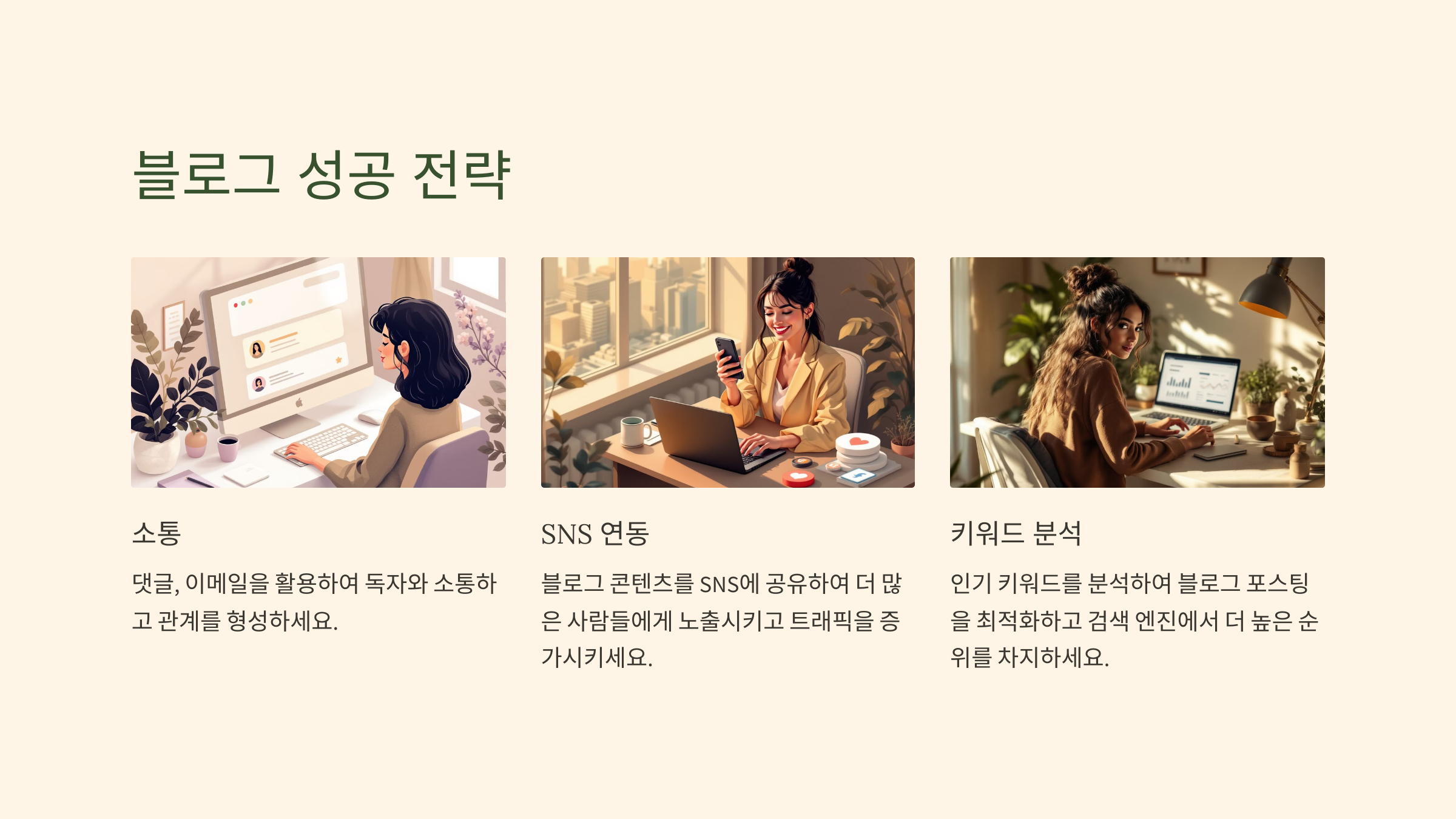 블로그는 꾸준한 콘텐츠 생산이 필수입니다. 초반에는 일주일에 1-2번 정도 포스팅을 목표로 하되, 글의 품질에 집중하세요. 글을 자주 쓰는 것도 좋지만, 내용이 알차고 독자들에게 가치를 제공하는 글이 훨씬 효과적입니다.