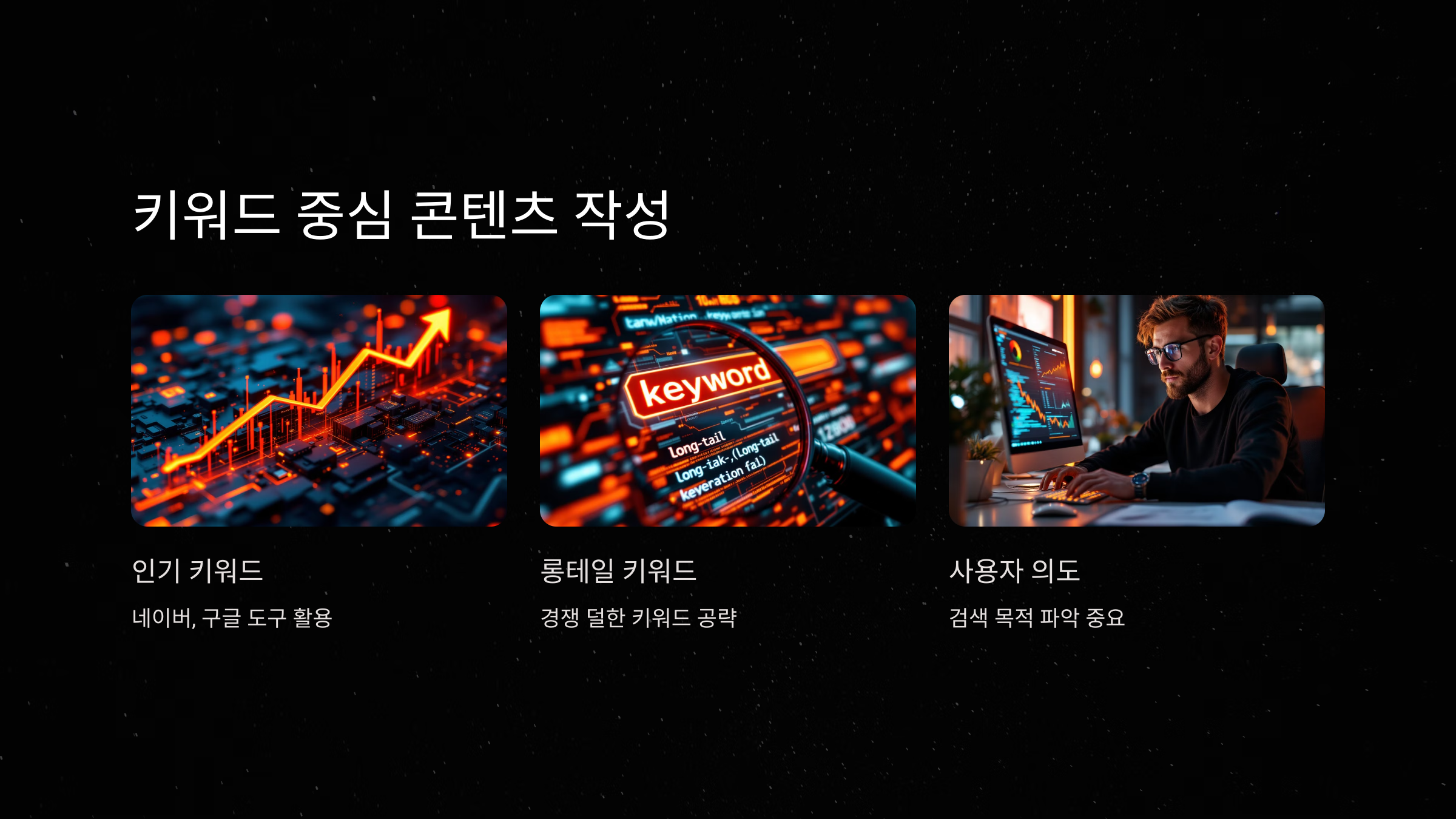 - 경쟁률 낮은 롱테일 키워드 활용: 경쟁이 치열한 단어 대신, 구체적이고 경쟁이 덜한 키워드를 찾아 공략하세요.