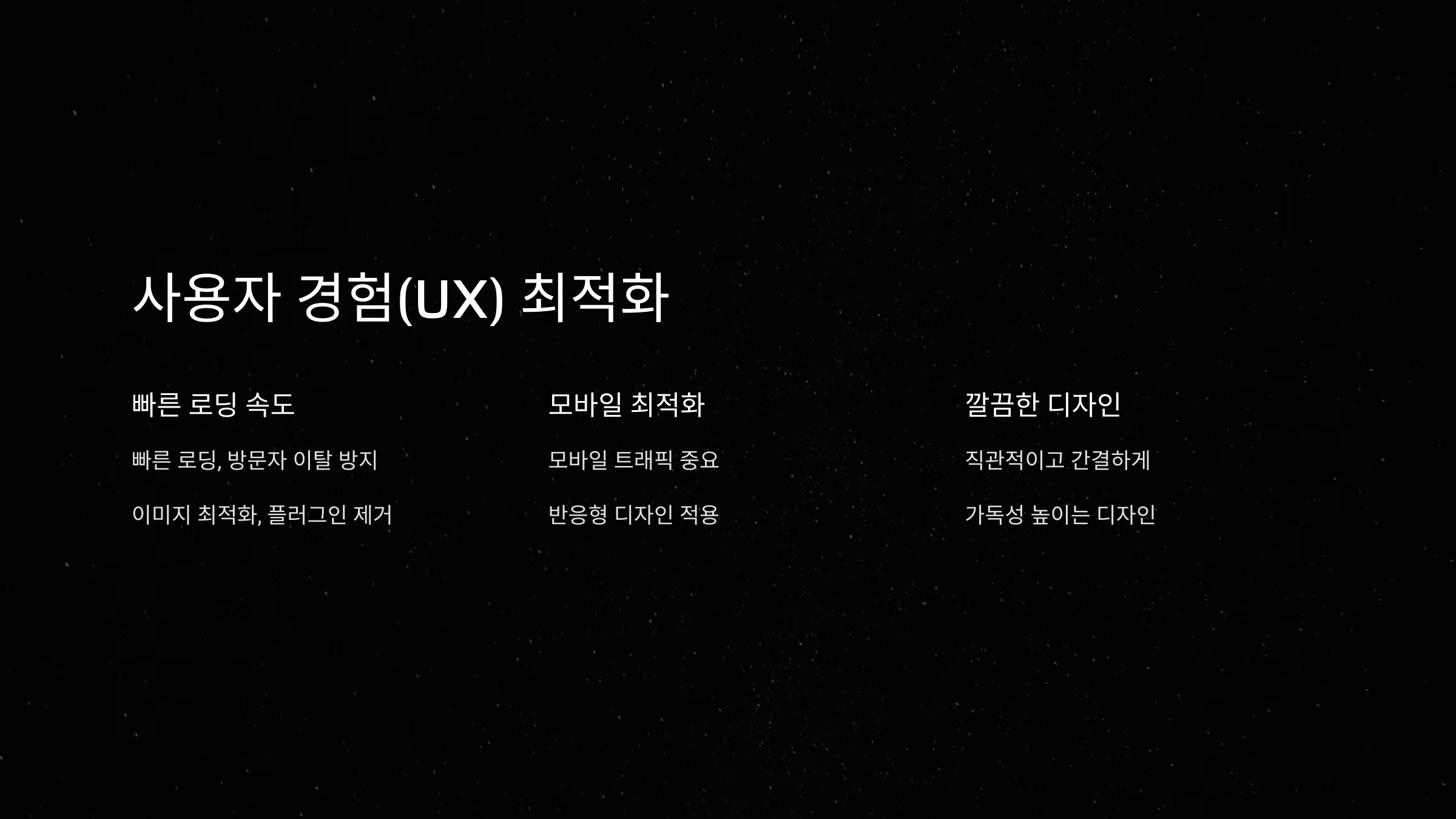 - 모바일 최적화: 모바일 방문자가 전체 트래픽의 대부분을 차지하기 때문에, 반응형 디자인을 적용하고 모바일 기기에서 잘 보이도록 구성하세요.