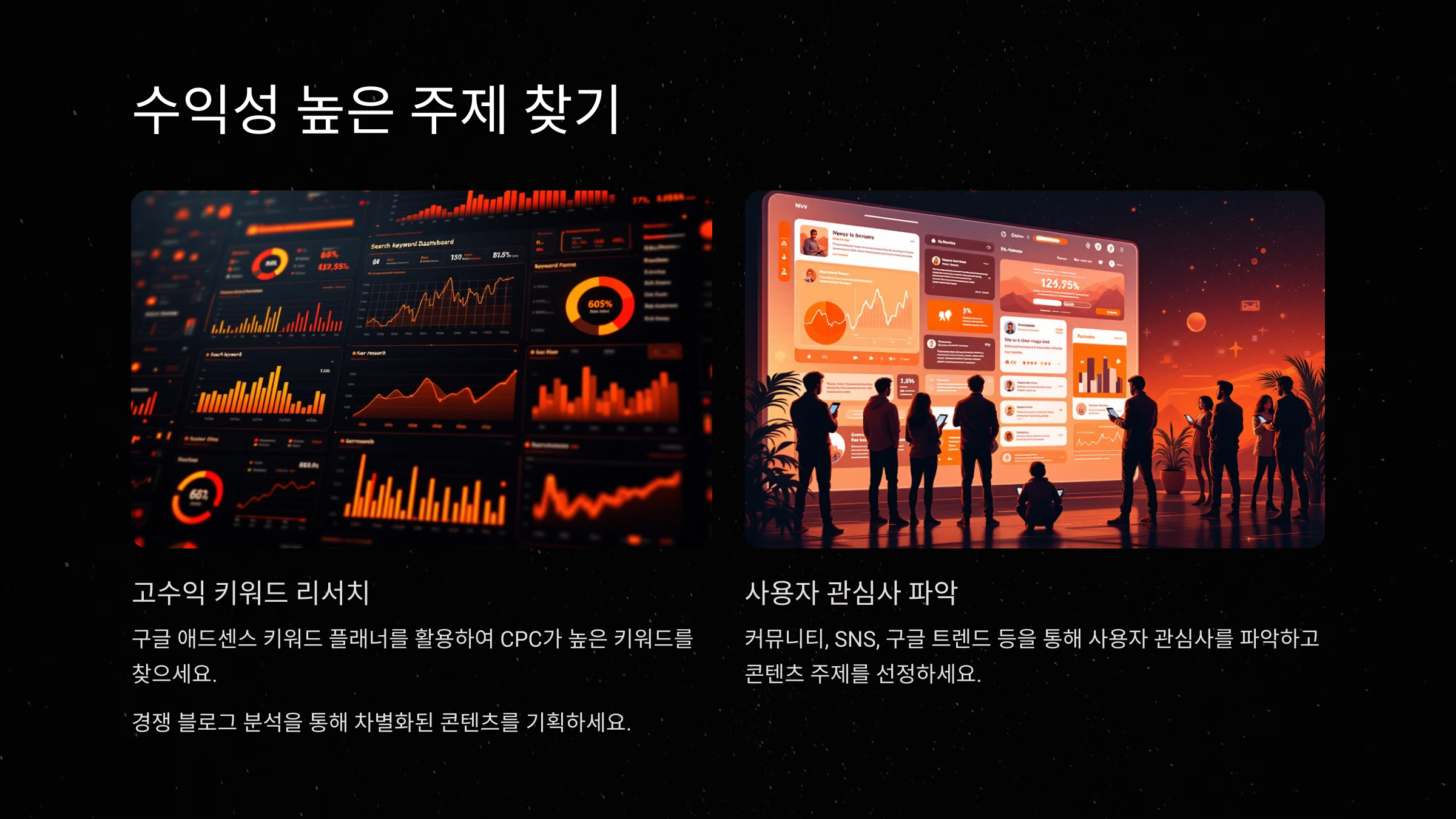 수익성 높은 블로그를 만들기 위해서는 트래픽을 유도할 수 있는 고수익 주제를 찾아야 합니다. 이 과정에서 중요한 것은 경쟁력 있는 키워드와 사용자 관심사를 파악하는 것입니다.