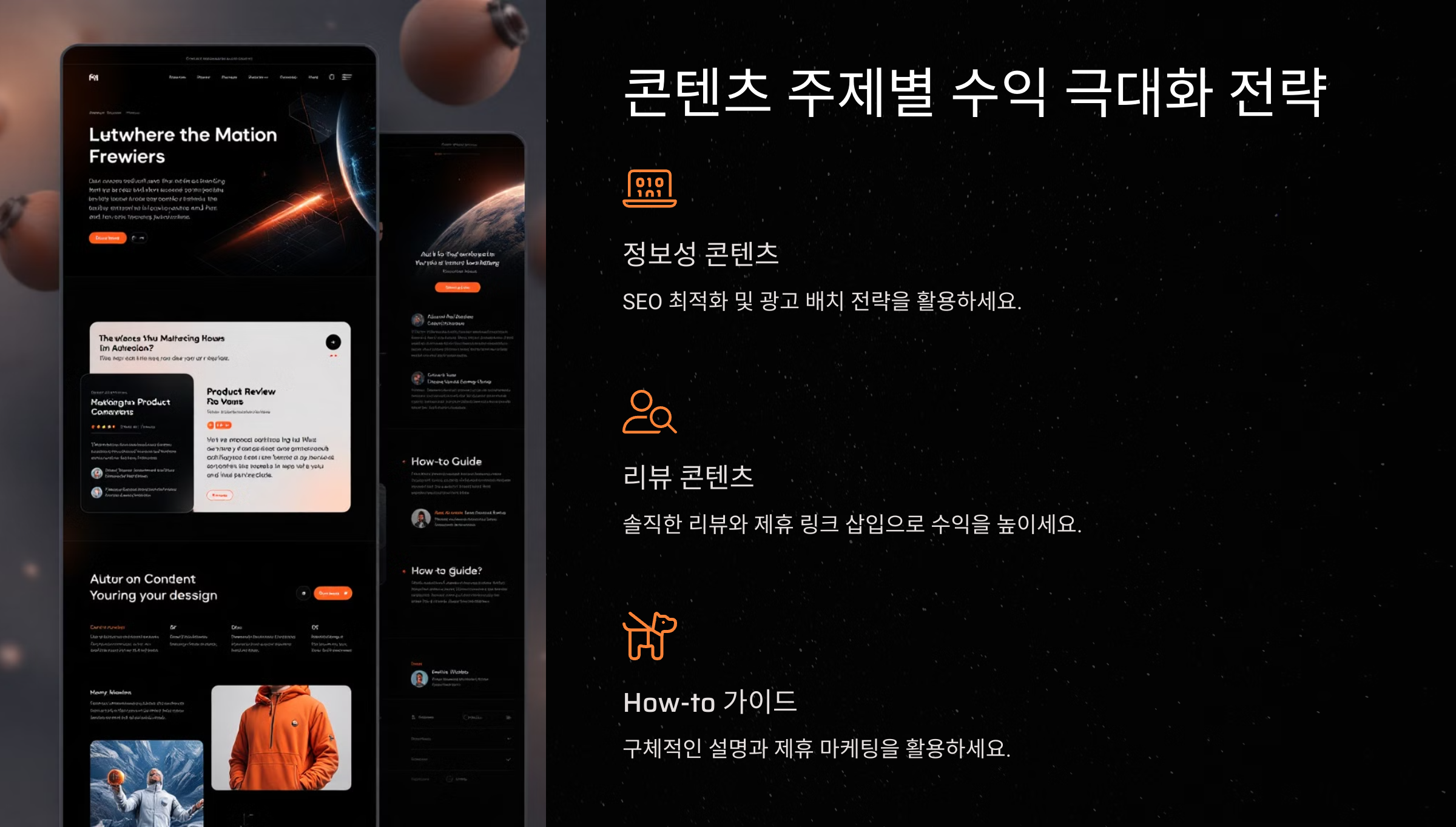 - 예시: IT 제품 리뷰, 화장품 추천, 온라인 강의 소개 등과 같이 상품이나 서비스를 소개하는 콘텐츠는 제휴 마케팅 수익을 극대화할 수 있는 주제로 적합합니다.
