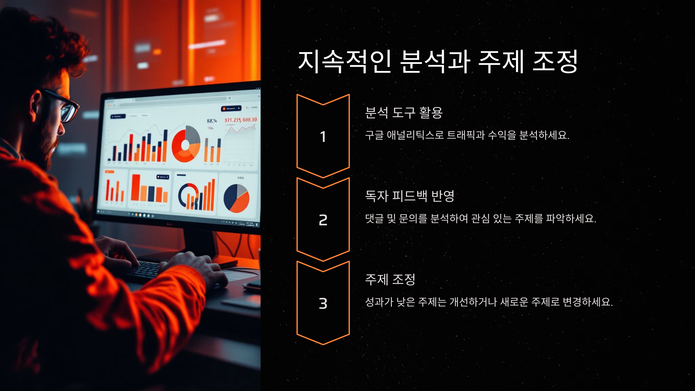 콘텐츠 주제를 한 번 선정했다고 끝나는 것이 아닙니다. 지속적으로 분석하고 트렌드나 수익성 변화에 따라 주제를 조정해야 블로그 수익을 꾸준히 극대화할 수 있습니다.