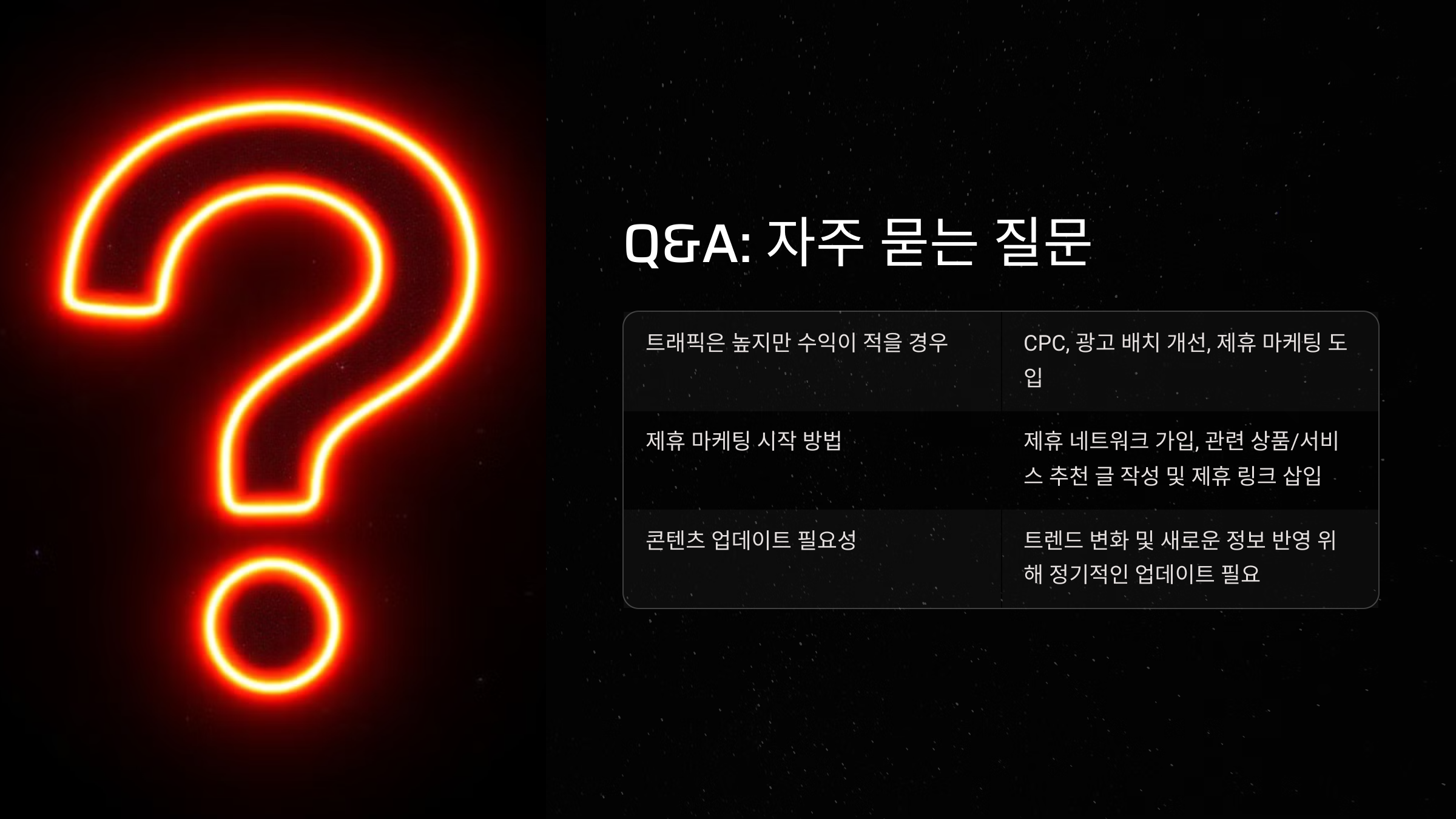 트래픽은 많지만 수익이 적다면 광고 클릭률(CPC)이나 광고 배치를 개선할 필요가 있습니다. 더 나아가 제휴 마케팅을 도입해 추가 수익을 창출할 수 있습니다.