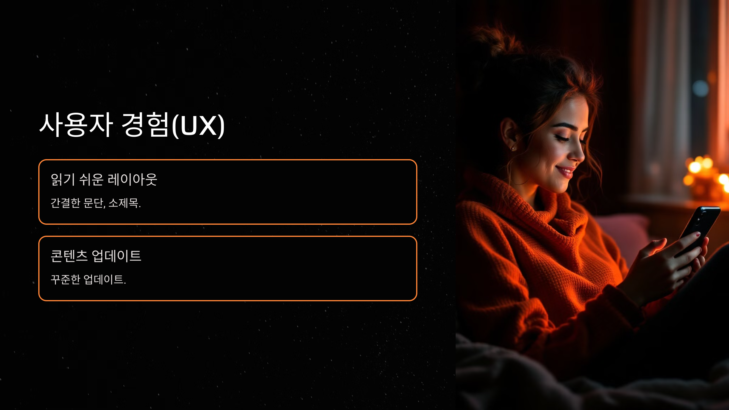 문단을 짧고 간결하게 유지하며, 소제목(h2, h3 태그)을 사용해 내용을 구조화하세요. 목록과 글머리 기호를 적절히 사용하면 가독성이 크게 향상됩니다.