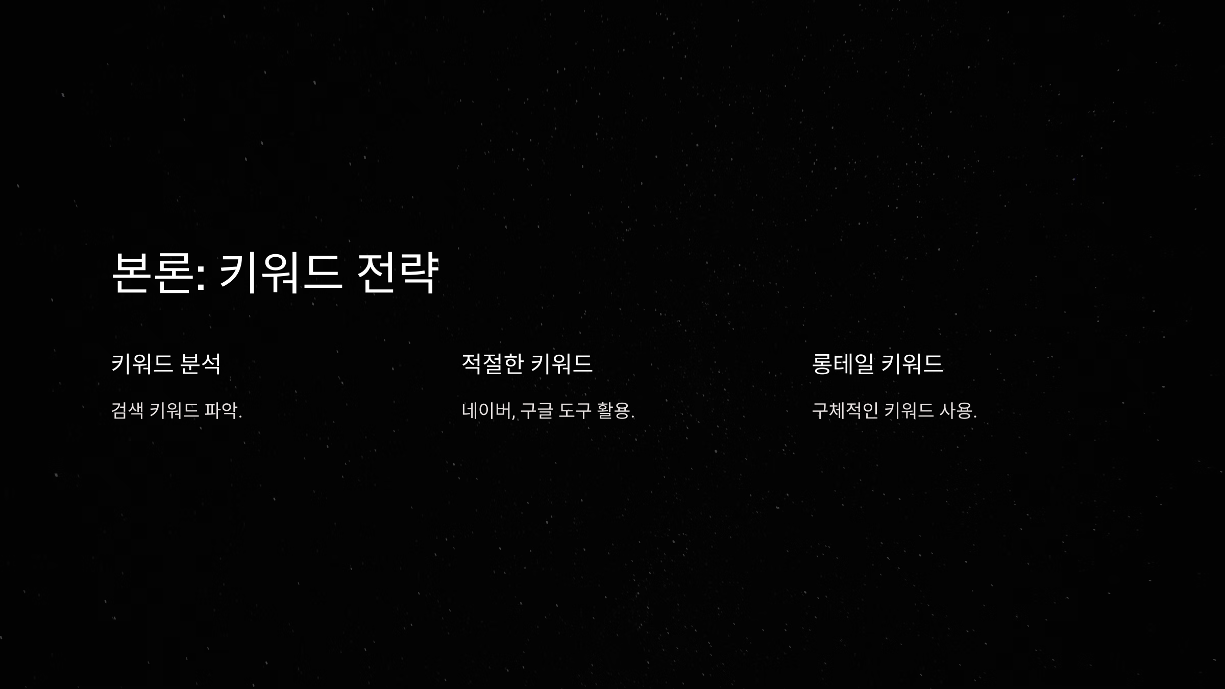경쟁이 치열한 단어보다는 구체적이고 긴 형태의 롱테일 키워드를 활용하면 상위 노출 가능성을 높일 수 있습니다. 예를 들어, "SEO 최적화" 대신 "티스토리 SEO 최적화 방법"과 같이 더 구체적인 검색어를 사용하는 것이 좋습니다.