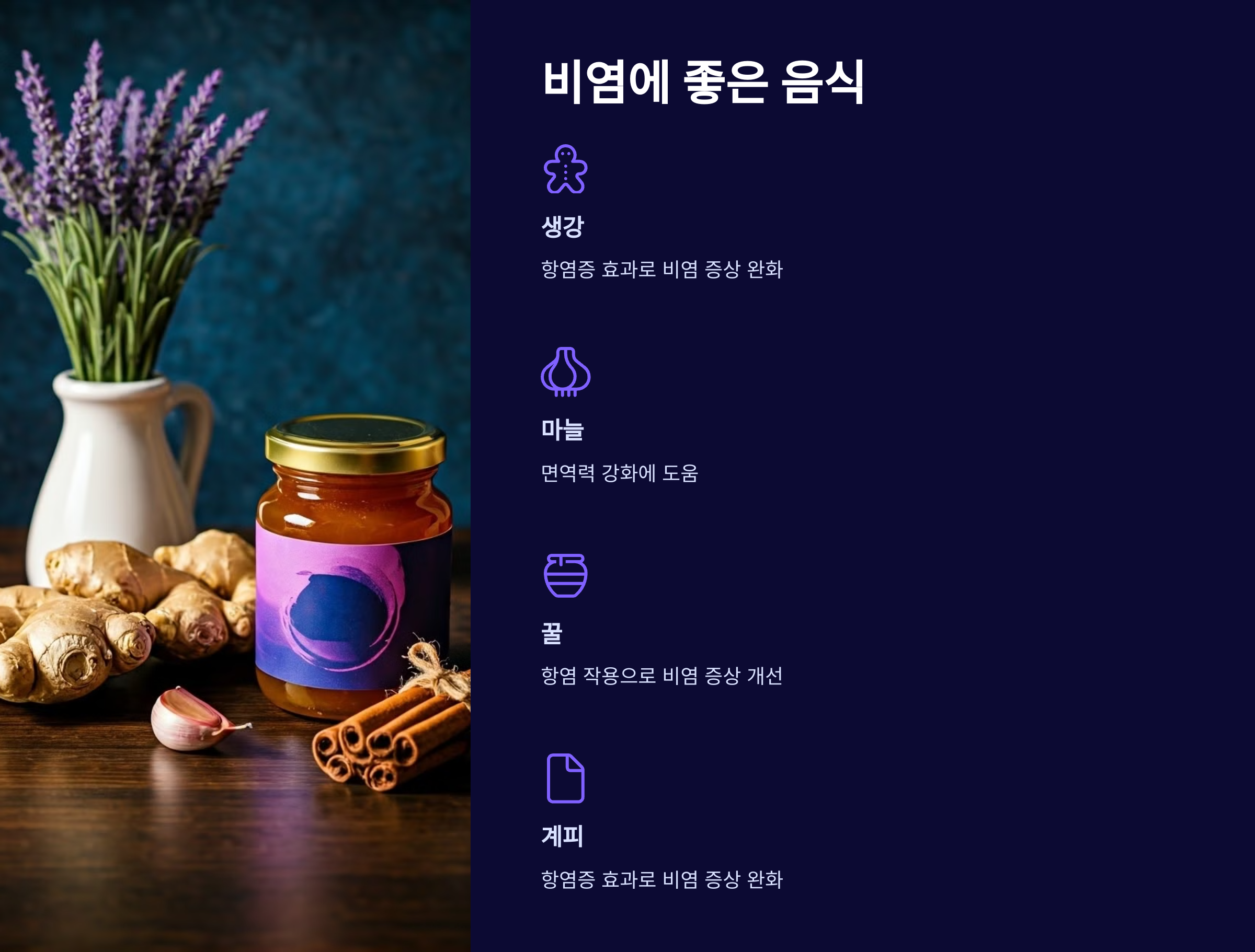 - 식이 요법: 염증 완화에 좋은 음식을 섭취하는 것도 도움이 됩니다. 예를 들어, 생강, 마늘, 꿀, 계피는 항염증 효과가 있어 비염 증상에 긍정적인 영향을 미칠 수 있습니다.